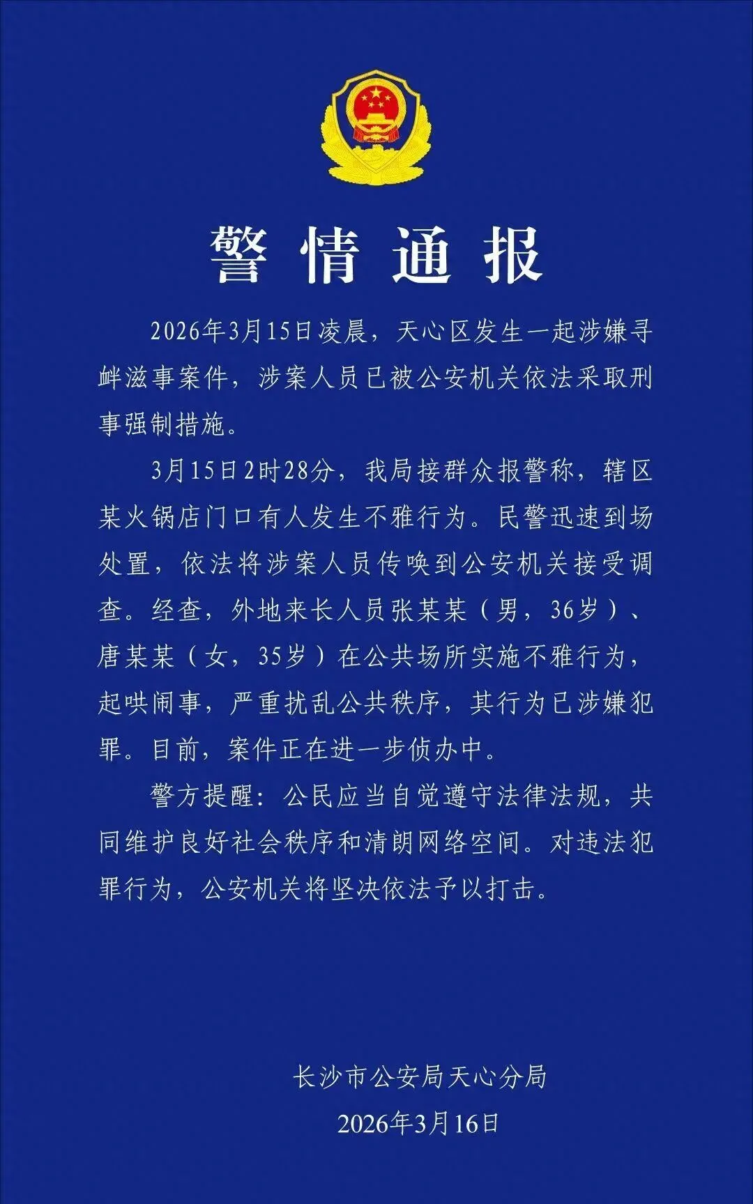 结果呢,第二天消息来了,3月16日,天心公安发通报,说的是这件事,外地来长沙的两个人,张某某男36岁,唐某某女35岁,在公共场合做了不雅行为,还起哄闹事,影响不小