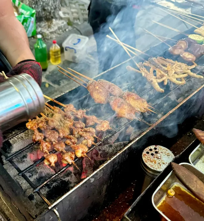 天色渐暗,路灯亮起,街角烧烤摊陆续升起烟火。老板们不紧不慢地翻着炭火,邻居们三五成群坐门口唠嗑。街道虽不宽,但热闹里透着亲切。老人们慢摇蒲扇,孩子们跑跳追逐,烟火气真真切切。