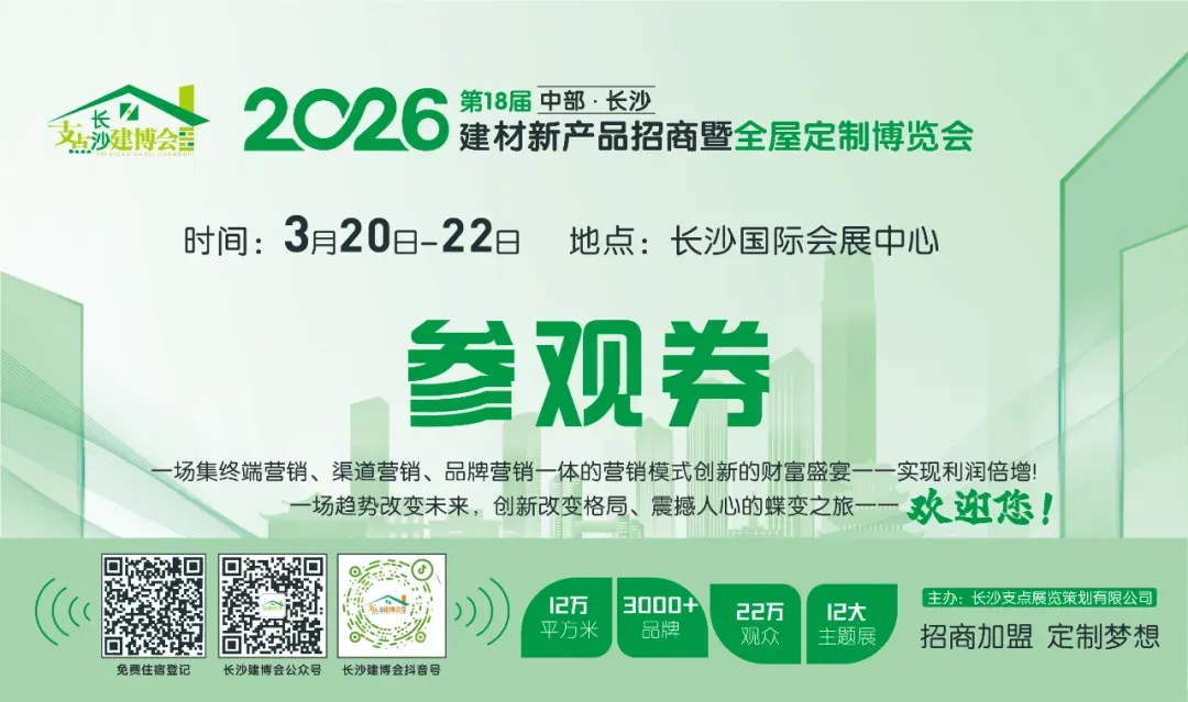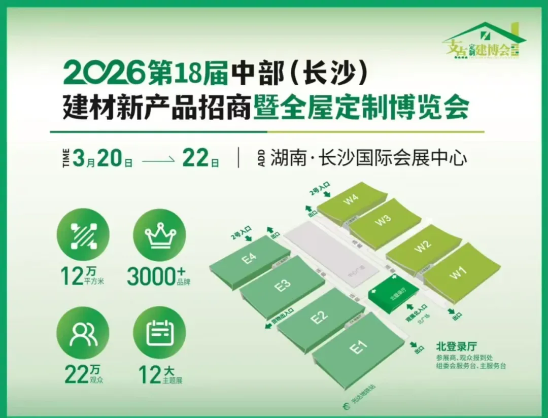 3月20日至22日,2026第18届中部(长沙)建材新产品招商暨全屋定制博览会(以下简称“长沙建博会”)将在长沙国际会展中心启幕。