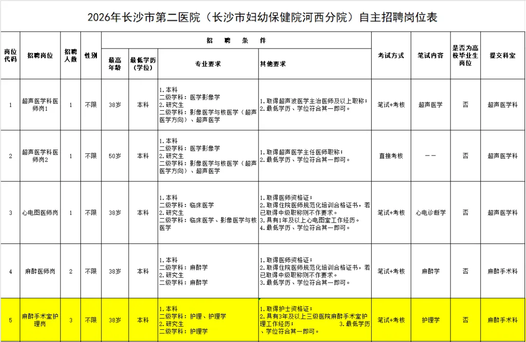 此次招聘岗位11个,招聘计划16名,详见《2026年长沙市第二医院(长沙市妇幼保健院河西分院)自主招聘岗位表》(附件1)。