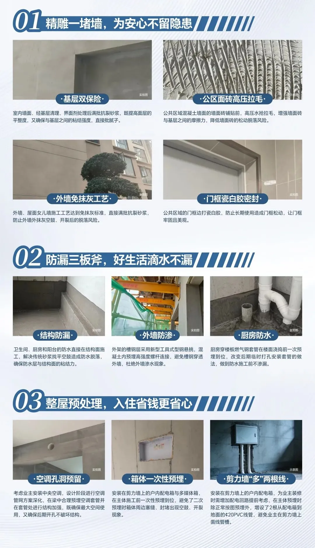 全现浇外墙+全铝膜工艺+三重防水,在看不见的地方精雕细琢;整屋预处理,提前预留空调空洞、户内配电箱/多媒体箱等,所有的多做一点、早做一步,只为让业主入住之时省钱更省心。