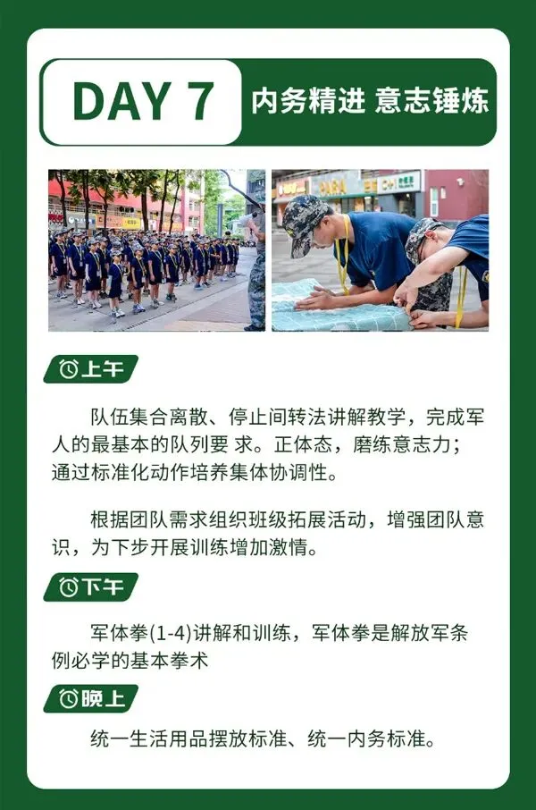 师资配比:7:1(20人一个班,一个教官,一个老师,还有摄影,高师资配比保证训练质量。校卫队,宿管阿姨24小时巡逻)