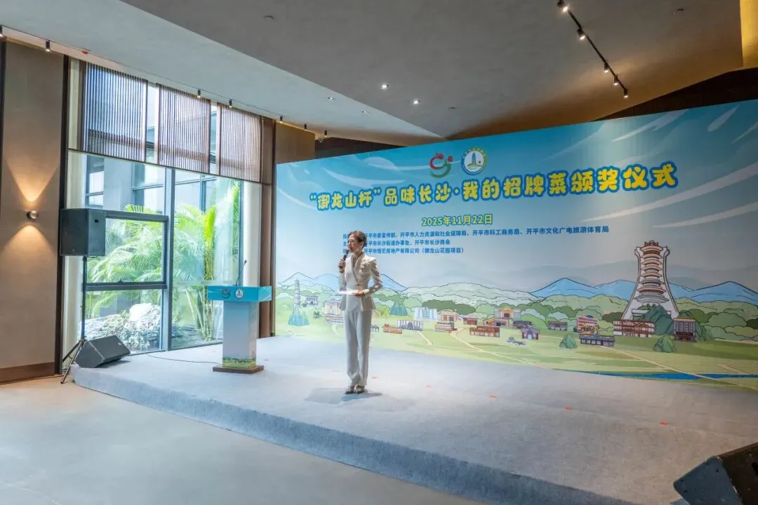 11月22日下午,由长沙街道办事处与长沙商会联合主办的“御龙山杯”品味长沙・我的招牌菜颁奖仪式暨开平市2025年第四季度促进消费活动在御龙山一楼营销大厅隆重举行。市委常委、市政协党组副书记、市委办公室主任、统战部部长、市直机关工委书记伍德斌,长沙街道党工委书记朱乔,开平市科工商务局局长吴劲夫,长沙街道党工委副书记、办事处主任陈炳钦,市委宣传部副部长余肖莹,市文化广电旅游体育局党组成员、副局长刘焕婵,市人力资源和社会保障局党组成员、副局长黄敏茵,长沙商会会长吴兆欢,开平市恒艺房地产开发有限公司董事长陈仁欢等领导嘉宾、餐饮商家代表、获奖选手及市民朋友齐聚现场,共同见证这场以美食为媒、以消费为核的盛会。