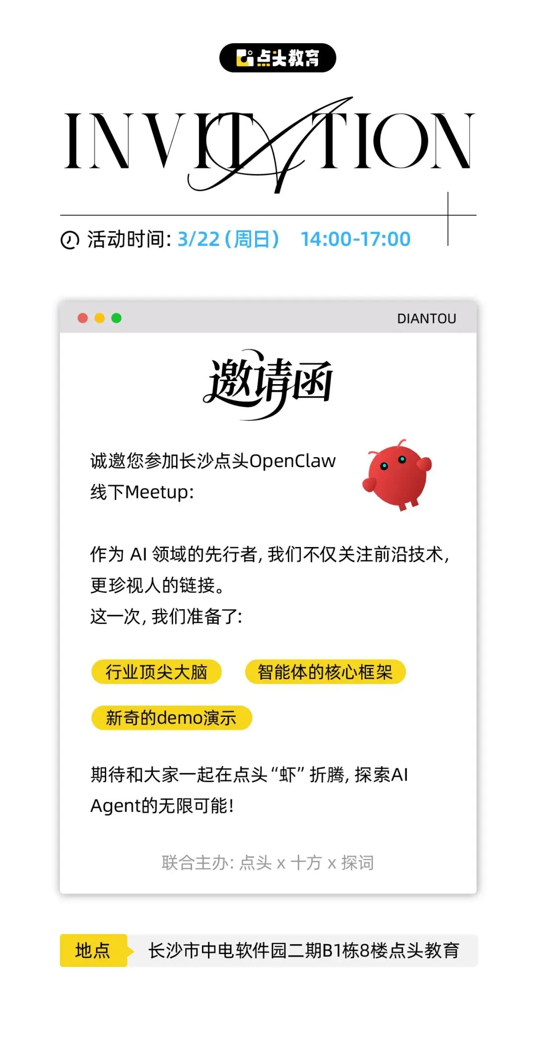 无论你是技术大牛还是入门新手,到了现场,大家只有一个共同的名字——点头AI探索者,只要你对AI Agent有好奇心、想认识同频的伙伴,都可以来和我们一起“虾”折腾!