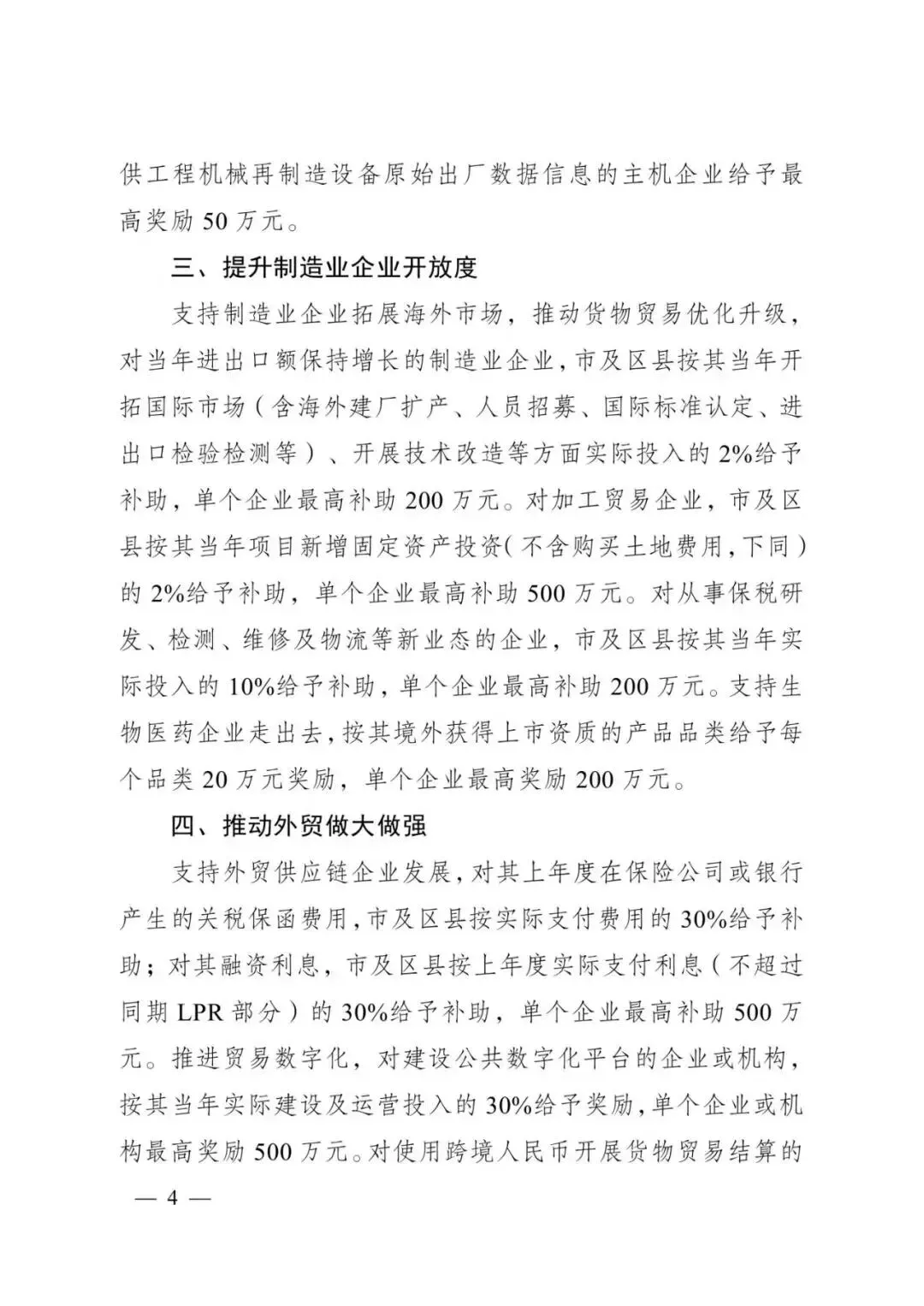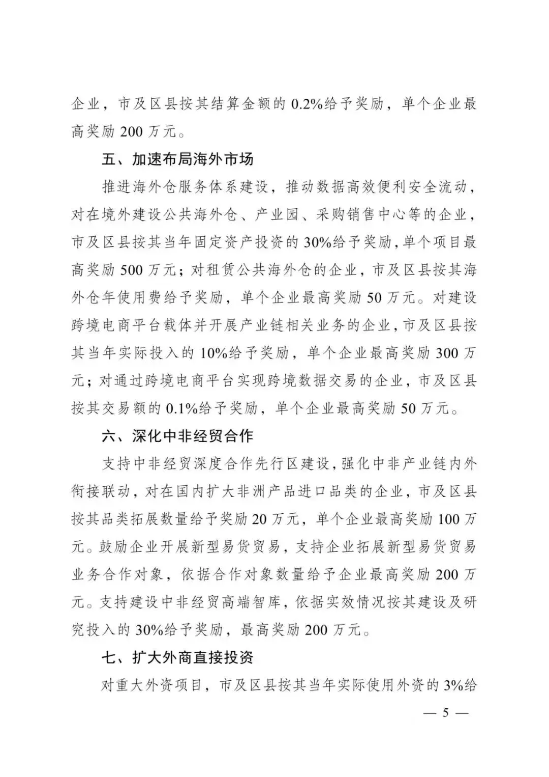 支持涉外服务机构发展,对提供知识产权、标准化、法律、仲裁、财务、咨询、评议等专业服务的机构,市及区县按其当年提供涉外服务实际收入的20%给予奖励,单个机构最高奖励200万元。
