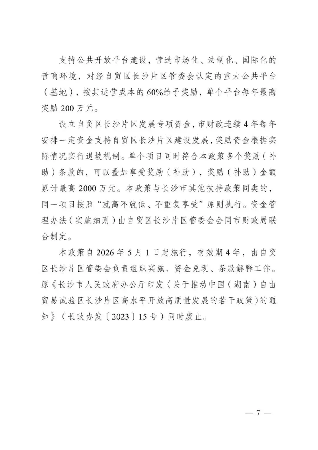 支持自贸区长沙片区各区块管理机构与境外自贸区(港)、园区开展国际合作,根据实效情况给予最高100万元奖励。