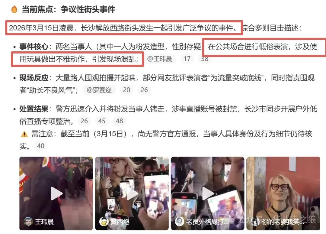 这个事的大致内容,就是两个人为了达到某种目的(有人说是为了博流量),就在长沙解放西路五一商圈人流密集的区域搞各种博眼球的举动,而且据说这两个人还进行了一些不可描述的骚操作,而且当时还有人对此事开启了网络直播,所以就引发大量路人围观、拍摄,现场交通和公共秩序出现了严重的混乱。