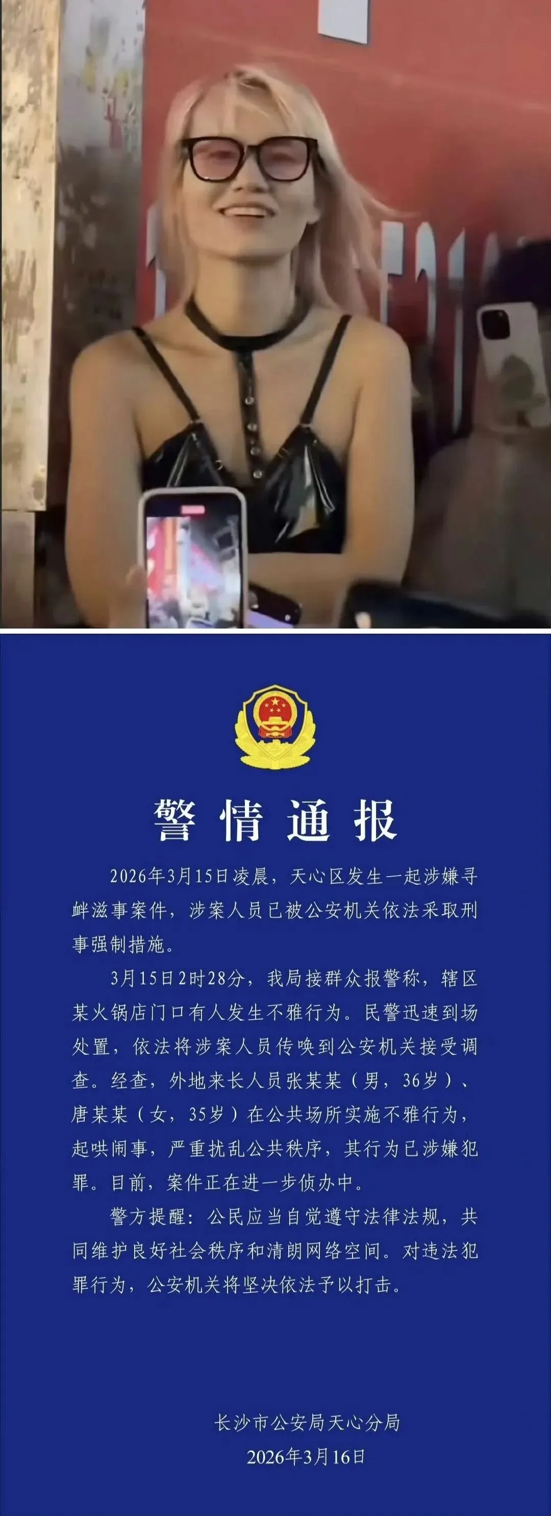 通报称,这是一起寻衅滋事案件,当事人已被刑事拘留,当事人在公共场所公然实施不雅行为,起哄闹事,严重扰乱公共秩序,已经涉嫌犯罪!