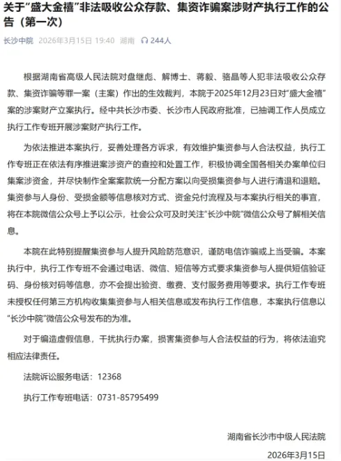 2026年3月15日,长沙中院发布首次退赔公告,成立执行工作专班推进资产查控与分配。