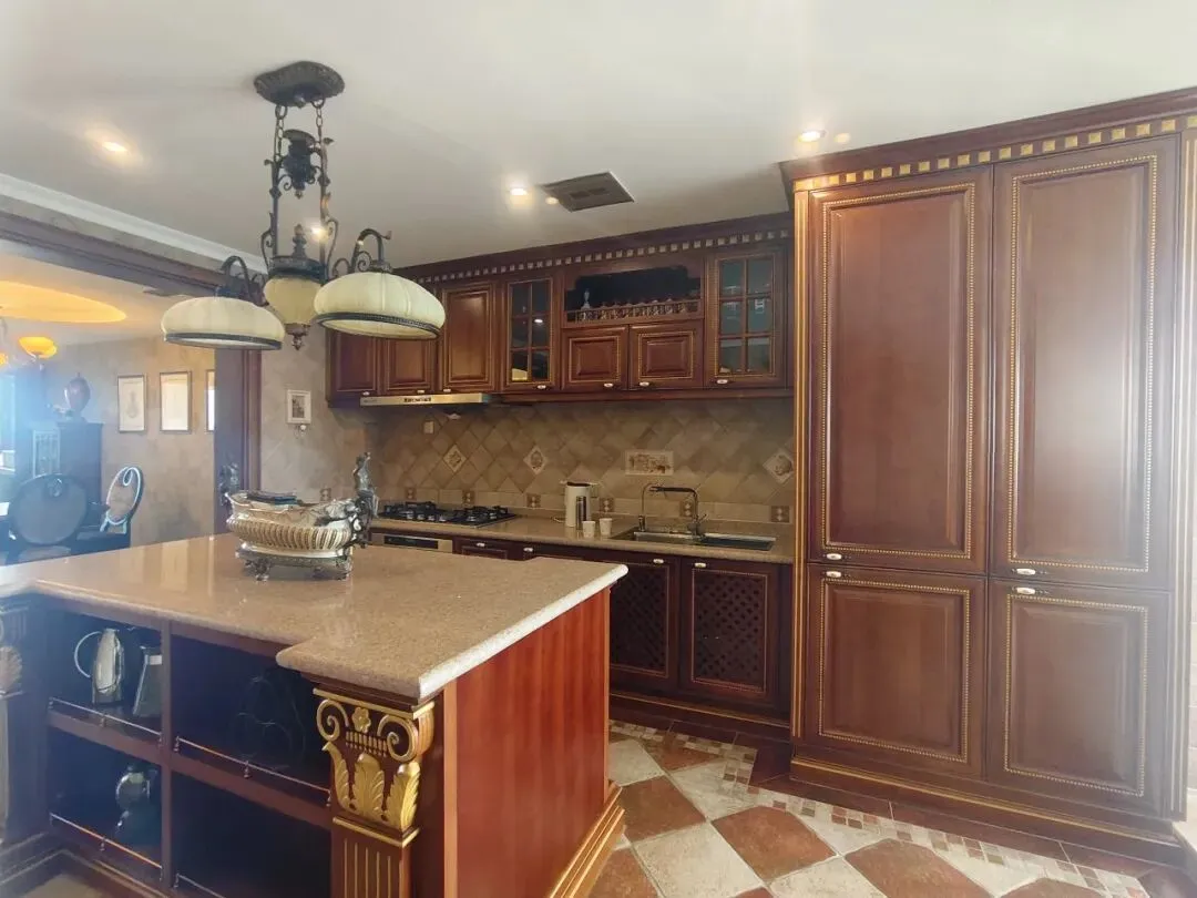 欧式风格的开放式厨房,兼具奢华质感与实用功能,与相邻空间餐厅、阳台无隔断,实现视觉与空间的延伸。整体风格统一,彰显高端家居的精致感。