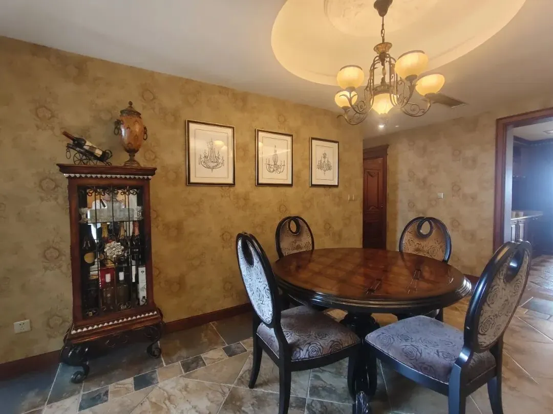 ● 材质风格:深色实木家具,花纹窗帘,瓷砖地面,欧式雕花元素(桌椅)。