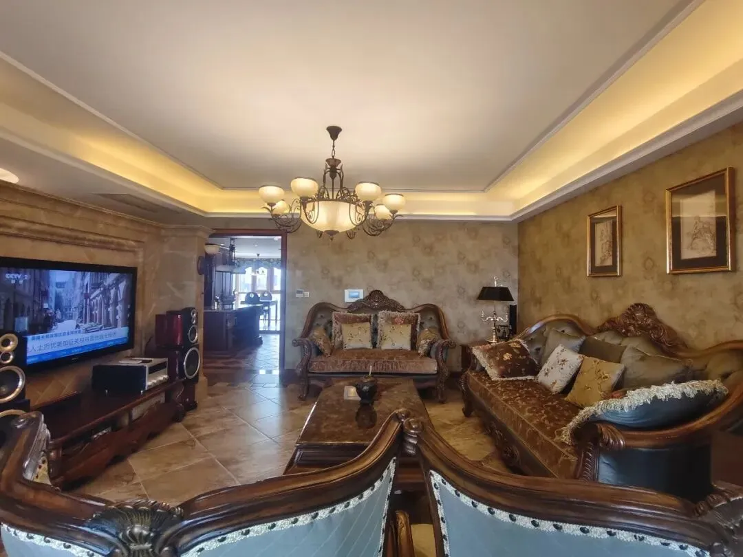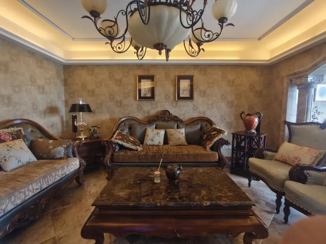 客厅通过古典风格的家具、装饰与色彩搭配,打造出“复古精致+温馨雅致”的居住氛围,细节处的雕花、刺绣、复古摆件等元素,让空间更具艺术感与独特性。