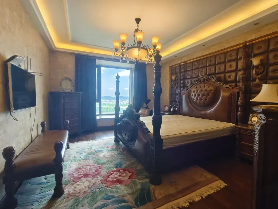 ● 卧室核心:四柱雕花大床(皮革软包+深色实木),搭配花卉图案地毯,床尾设皮质长凳,营造欧式仪式感。