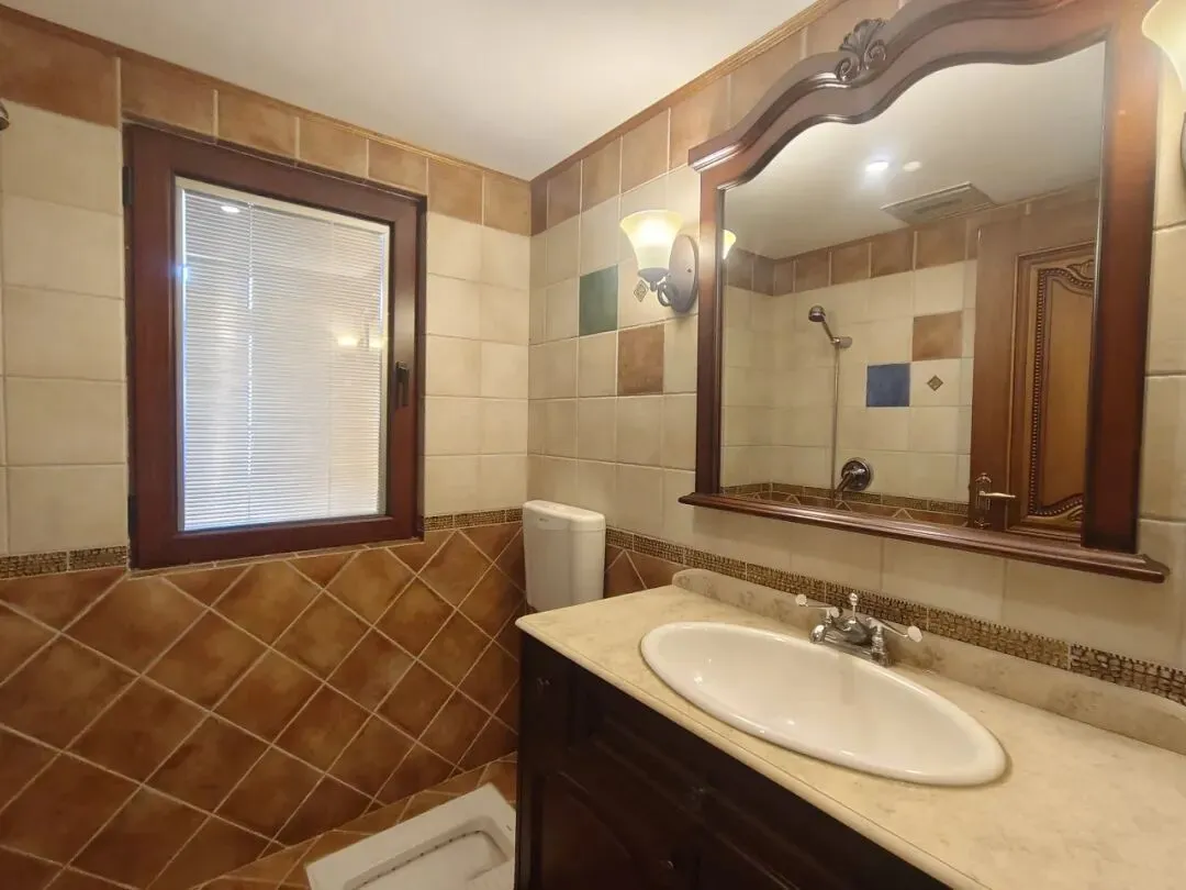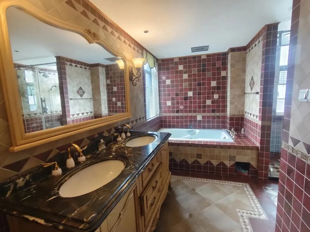 ● 卫生间:暖棕瓷砖(地面菱形/墙面拼色),洗手台(大理石台面+椭圆盆),蹲便器,壁挂镜柜+暖光壁灯。