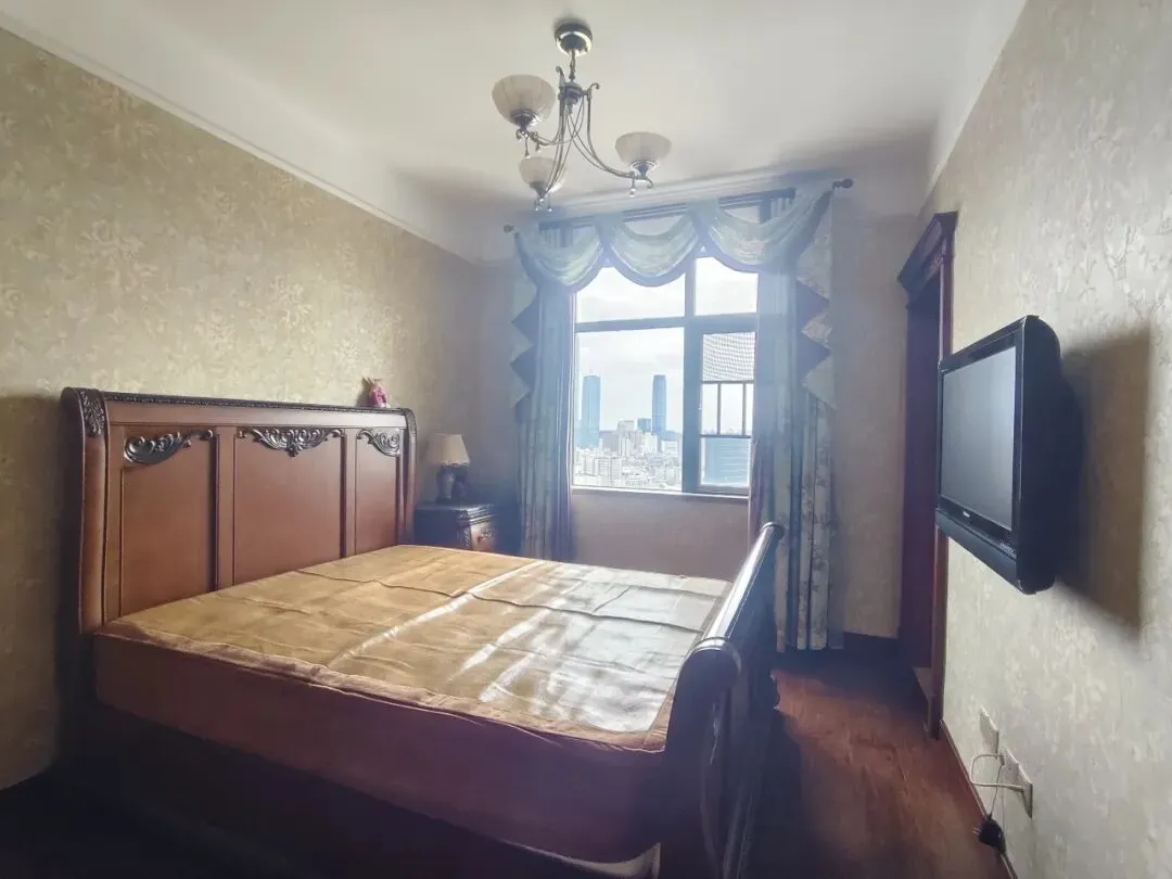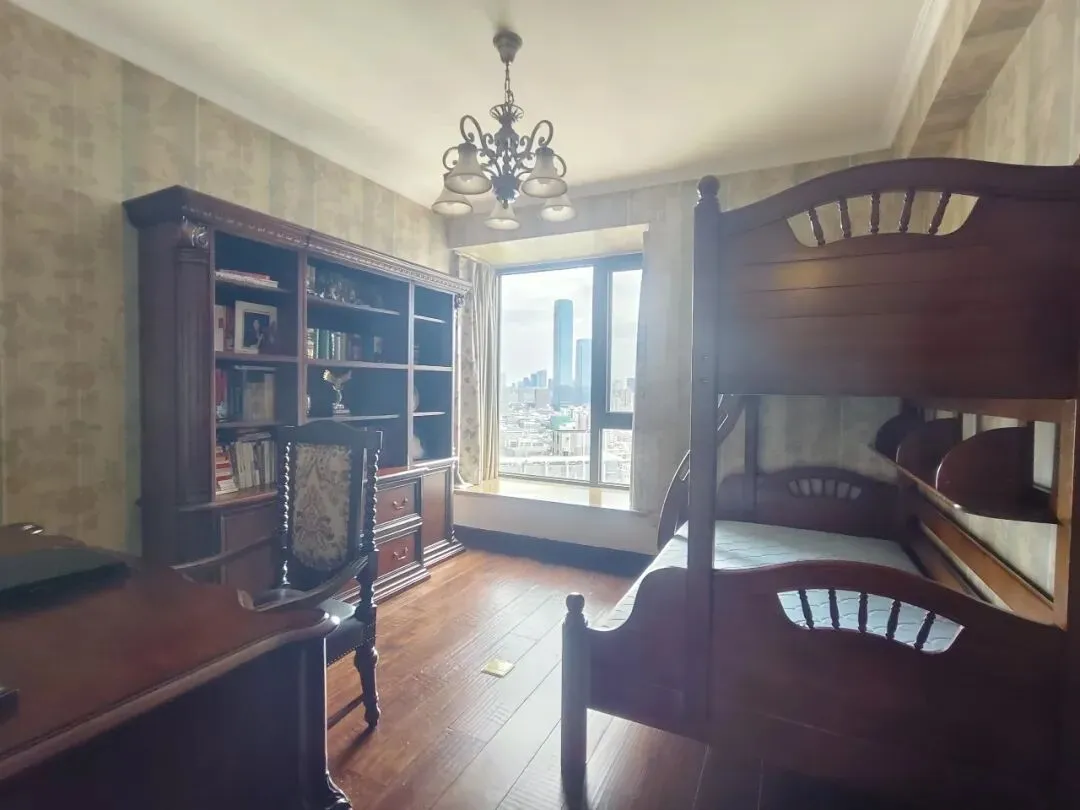这个次卧是“睡眠+学习”一体化的欧式风格空间,以深色实木家具打造沉稳氛围。房间内嵌入整墙书柜(兼收纳/展示),搭配书桌+雕花椅组成学习区;另一侧设实木上下铺(双层床),满足多人居住需求。大面落地窗引入充足光线,窗外城市景观一览无余,整体空间紧凑实用,兼具书房的书香与卧室的休憩功能。