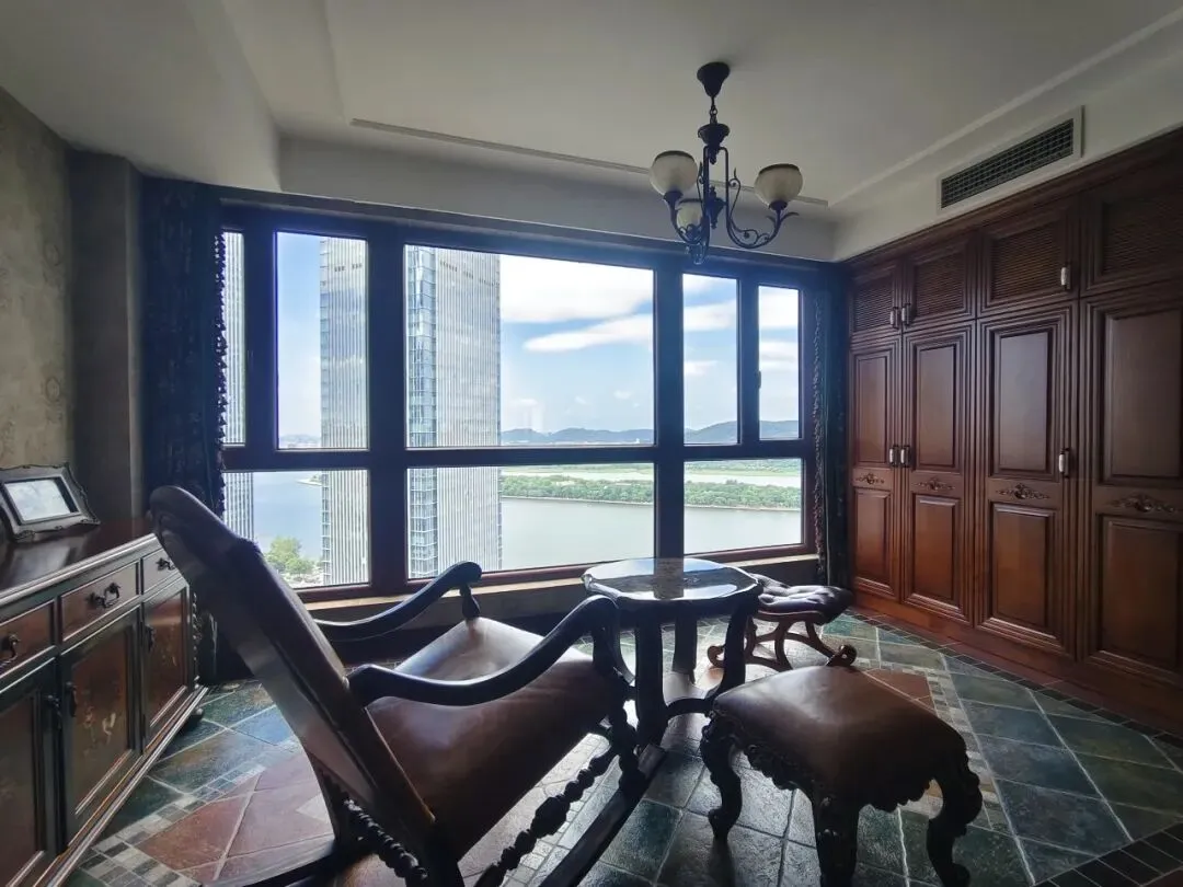 这个阳台是欧式休闲风格的观景空间,以复古实木家具、花纹壁纸与大面落地窗打造私密雅致的放松场景。摇椅、小圆桌与脚凳组成舒适的休闲角,深色实木储物柜兼顾收纳与装饰;窗外可俯瞰湘江江景,远眺岳麓山轮廓与橘子洲头绿意,城市建筑群与自然盛景相映成趣,让空间兼具休憩与观景的双重功能,细节处的复古吊灯、花卉摆件更添轻奢质感。