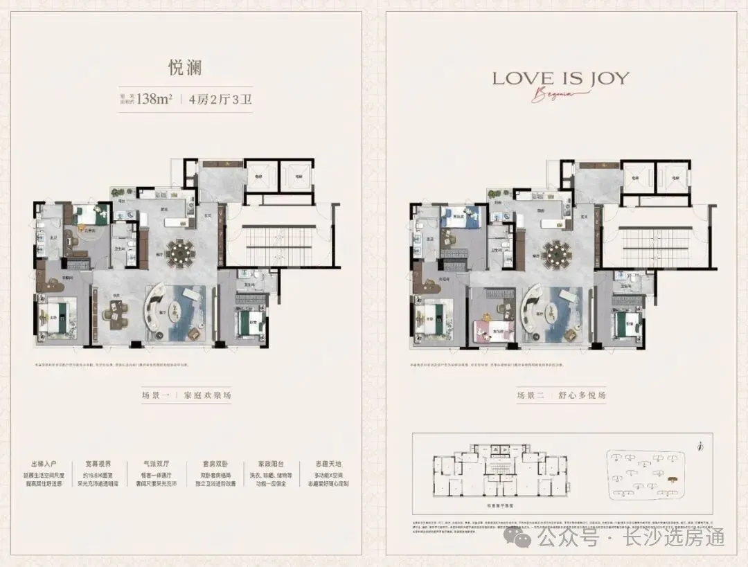 项目共规划13栋建面128-172㎡新规住宅,于去年12月首开,2梯2户纯板楼设计,四房产品起步。得房率捅破长沙天花板,达到约120%。在住宅新规收紧的当下,已成绝版!