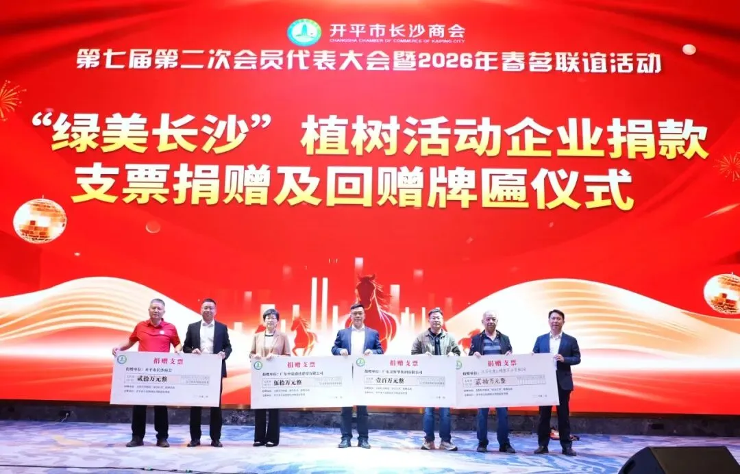 当晚最温暖的环节当属“绿美长沙”植树活动捐赠仪式。广东金辉华集团有限公司、广东中盈盛达建设有限公司、开平市长沙商会、开平市潭江橡塑实业有限公司等企业积极响应“绿美长沙”生态建设号召,现场捐赠近200万元,专项支持长沙街道绿化美化工程,助力绿美开平生态建设。
