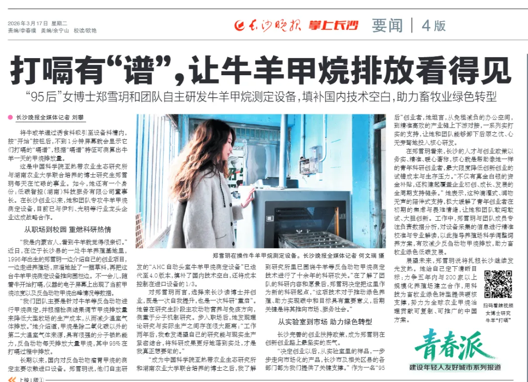 这是中国科学院亚热带农业生态研究所与湖南农业大学联合培养的博士研究生郑雪玥每天在忙碌的事业。如今,她还有一个身份:低碳智控(湖南)科技服务有限公司董事长。在长沙创业以来,她和团队专攻牛羊甲烷测定设备,目前已与伊利、光明等行业龙头企业达成战略合作。