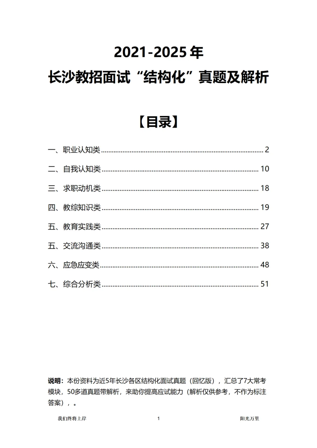 1.以长沙教招50道结构化面试真题带解析,带你了解长沙结构化出题方向及规律,配有人为解析,给你提供答题思路及技巧!参考必看,让你不输在第一关。