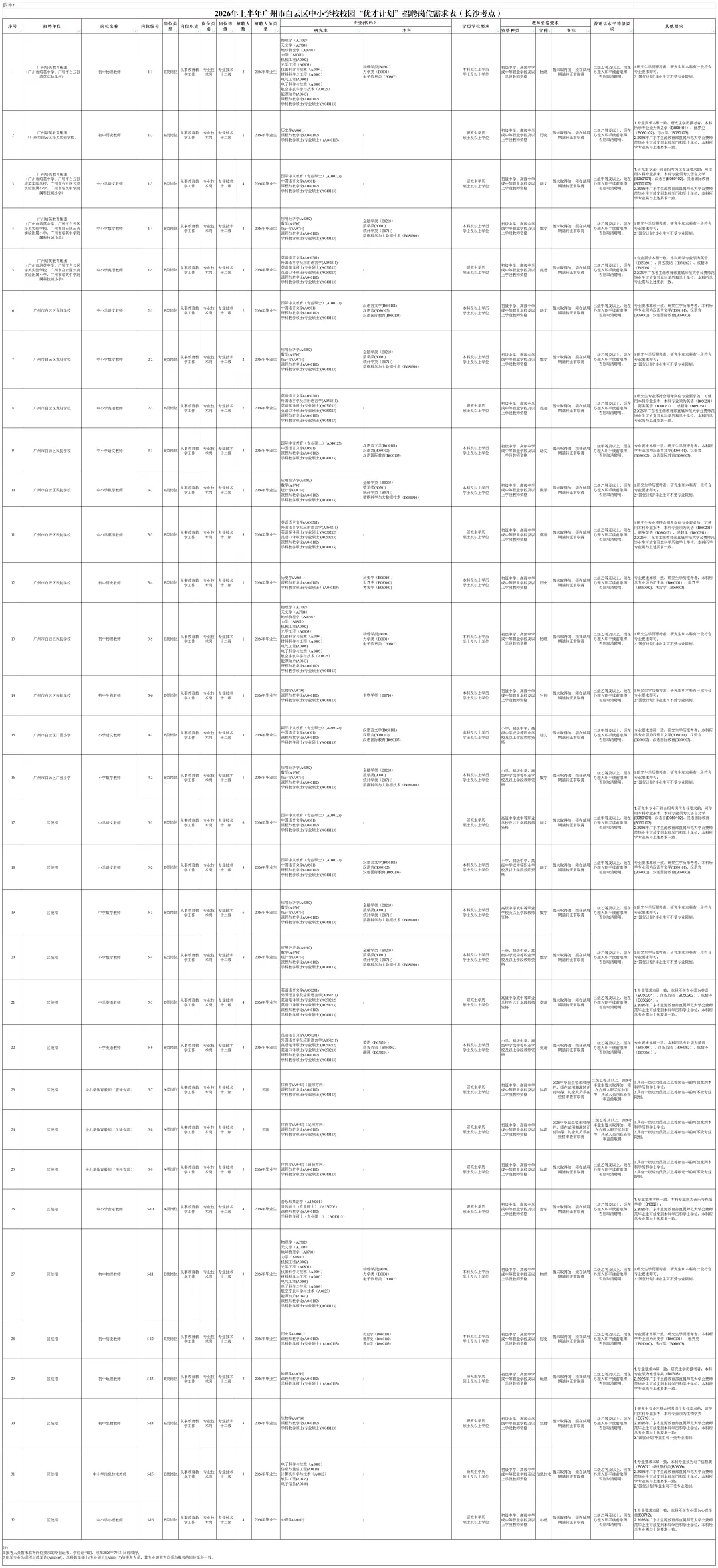 2.“百万英才汇南粤”2026年上半年广州市白云区中小学校校园“优才计划”招聘岗位需求表(长沙考点)