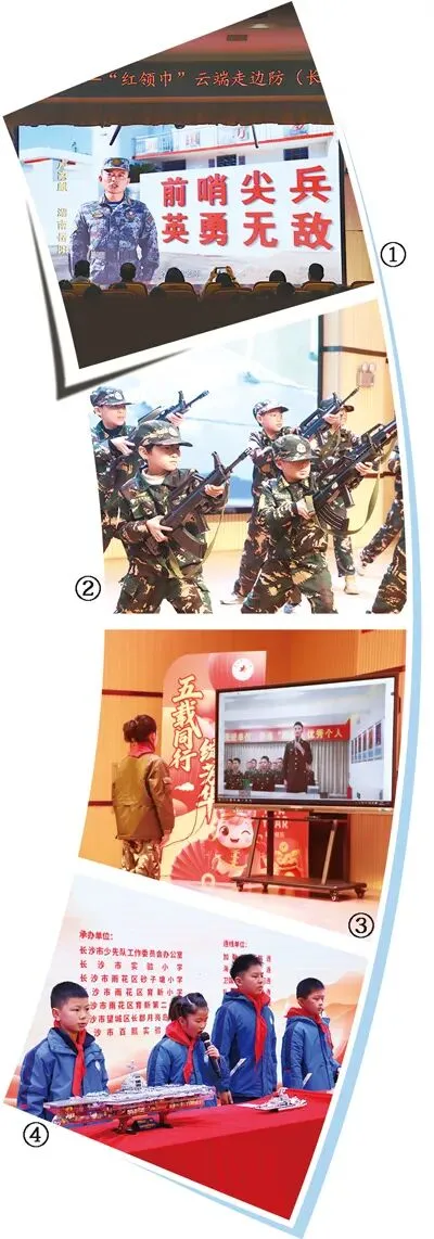图①:“红领巾”云端走边防活动现场,湖南省长沙市实验小学学生聆听海防战士视频寄语。颜 美摄图②:湖南省长沙市雨花区育新第二小学“幼狼特战队”进行战术演示。李招弟摄 图③:在视频连线中,湖南省长沙市雨花区育新第二小学学生和官兵互动对话。李招弟摄 图④:湖南省长沙市实验小学学生代表展示手工制作的舰艇模型。颜 美摄