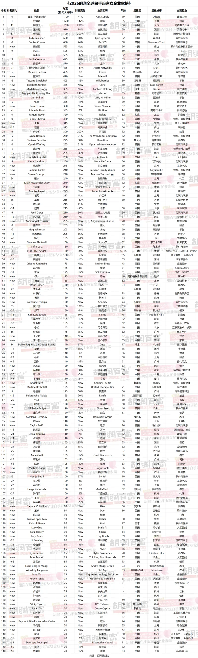 2026胡润全球白手起家女企业家榜。 胡润磅究院供图