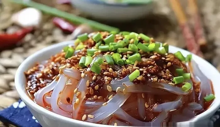 调味是刮凉粉的精髓,加入酱油、醋、辣椒油、蒜末、香油,再配上花生碎、榨菜丁、葱花,搅拌均匀后,每一根凉粉都裹满了料汁。入口冰凉,凉粉滑溜溜的,带着绿豆的清香,酸辣开胃,瞬间驱散夏日的燥热。在南门口、文庙坪等老街,夏季的凉粉摊前总是围满了食客,是平价又美味的消暑小吃。