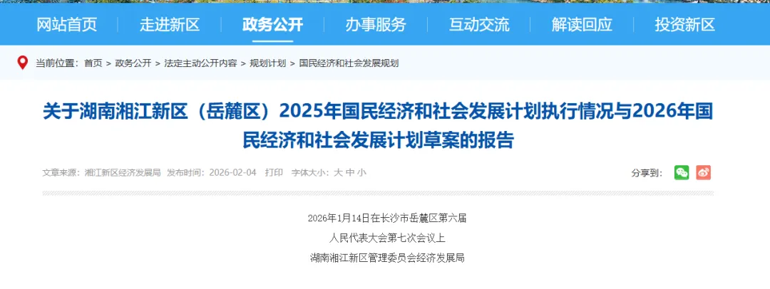 关于湖南湘江新区(岳麓区)2025年国民经济和社会发展计划执行情况与2026年国民经济和社会发展计划草案的报告》。