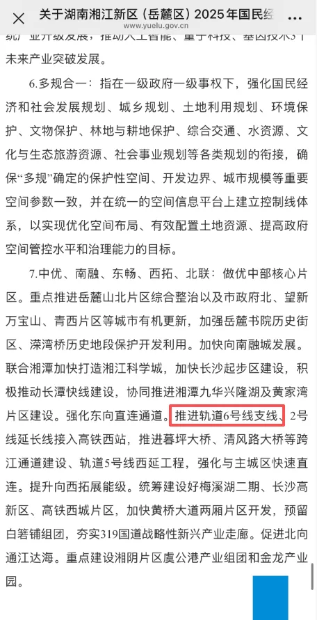 2026年,湖南湘江新区将推进轨道6号线支线项目建设。