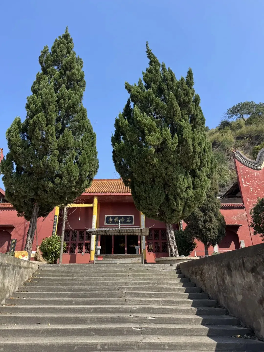 十几分钟就到了石峰禅寺,耳边佛音袅袅,寺庙前两棵高大的松柏树,