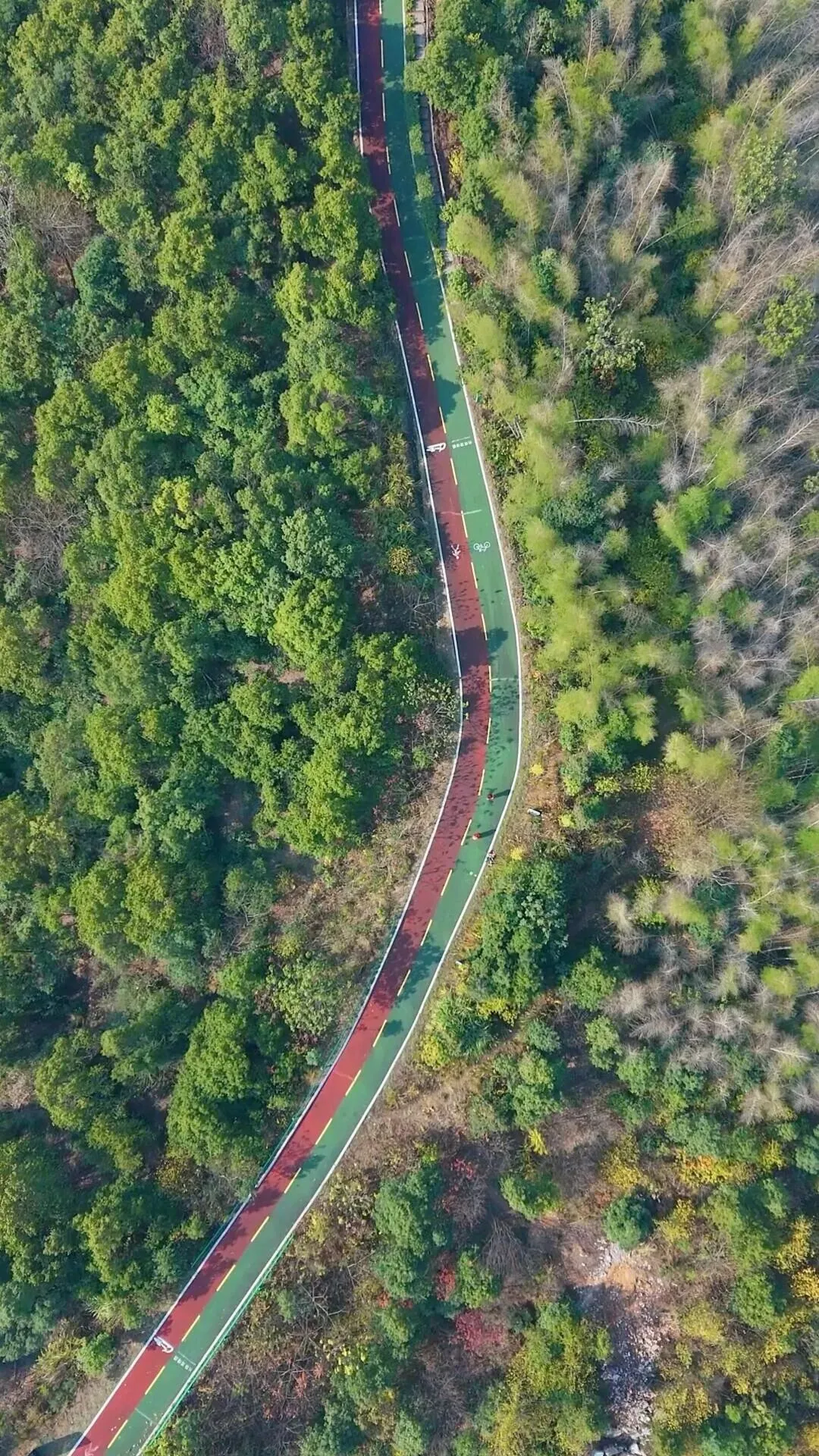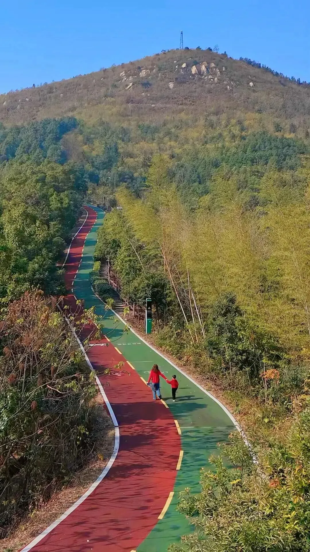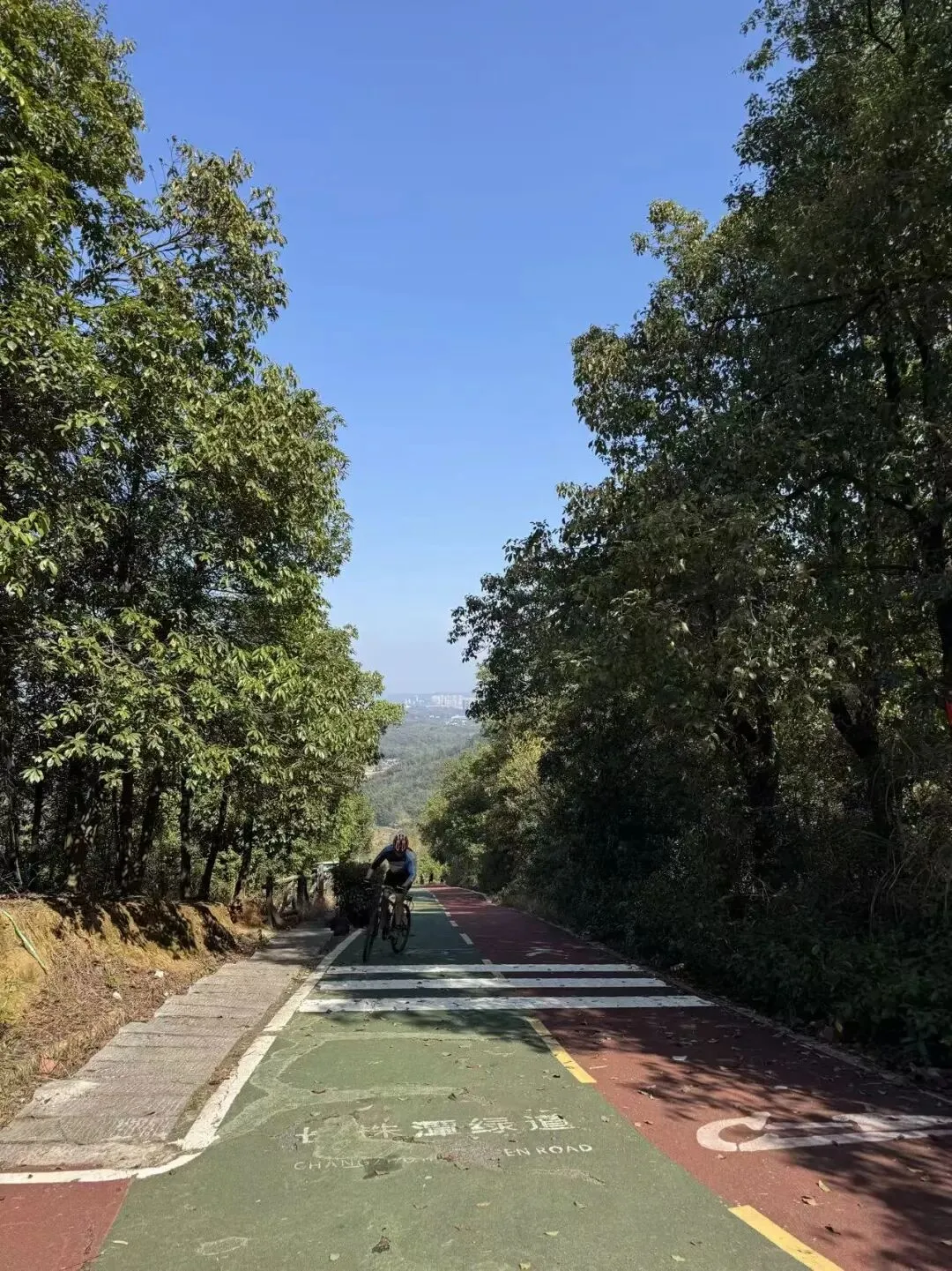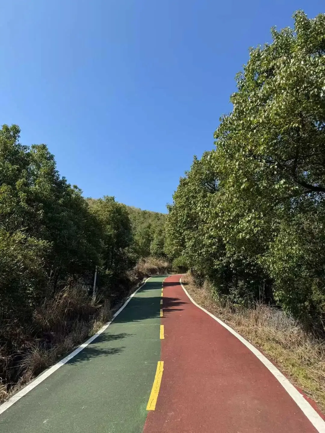 上山的路十分好走,是宽阔的大马路,红绿相间的绿道,均铺设了塑胶,行走其上舒适宜人。