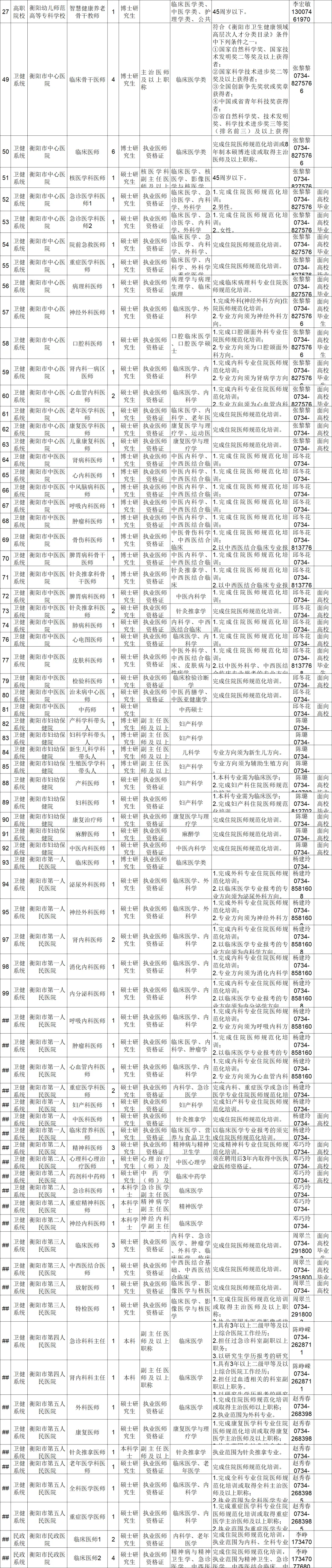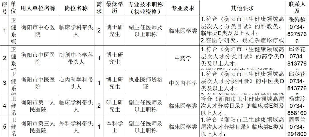 衡阳古称衡州,雅称"雁城”,是国家区域重点城市、省域副中心城市,总面积1.53万平方公里,常住人口643万,辖五县二市五区;是全国文明城市、国家卫生城市、国家创新型城市、国家园林城市、中国优秀旅游城市。衡阳是历史厚重的文化之城。在2200多年有记载的历史中,留下了神农创耒、祝融取火、大禹治水远古传说,是湖湘文化的重要发源地。中华四大发明,衡阳有其一:蔡伦造纸;中国最古老的四大书院,衡阳有其一:石鼓书院;中华五岳,衡阳有其一:南岳衡山;明末清初世界两大唯物主义哲学家,衡阳有其一:王船山,被誉为“东方的黑格尔”。衡阳是区位优越的枢纽之城。扼两广、锁荆吴,历为商贾云集之所、兵家必争之地,是全国性综合交通枢纽城市、陆港型国家物流枢纽城市。拥有1个国家主要支线机场——南岳机场、1条2000吨级湘江黄金水道、8条高速、2条普铁、4条高铁。南岳机场旅客吞吐量排名全省第三,衡阳东站旅客发送量排名全省第二,全市立体交通网络加速建设。衡阳是人才辈出的英雄之城。近现代史上涌现了共和国十大元帅之一的罗荣桓,中国革命先驱夏明翰,中国同盟会第一个女会员、“一代女魂”唐群英。1944年的衡阳保卫战,1.7万守军抵御11万日寇长达47天,打出了中华民族的志气和尊严,被誉为东方的“莫斯科保卫战”,衡阳因此成为全国唯一的“抗战纪念城”。中华人民共和国成立后,衡阳二七二厂、七一二矿为第一颗原子弹提供了关键原材料,为我国的国防事业和核工业立下了不朽的功勋。衡阳是禀赋优良的产业之城。衡阳是中部26个老工业基地之一、全国32个互联网骨干网节点城市之一、国家级承接产业转移示范区、“科创中国”首批试点城市。连续四年上榜全国先进制造业百强城市,连续四年上榜全国数字百强城市,连续四年跻身全国“城市科技创新竞争力”百强。“十四五”以来,接续推进“制造立市、文旅兴城”发展战略,全市地区生产总值年均增速居全省第二。衡长株潭特高压输变电装备产业集群入列国家先进制造业集群。盐卤化工新材料产业集群、常宁市铜铅锌材料产业集群入选国家中小企业特色产业集群。智能衡器计量产业园蓄势腾飞,助力衡阳打造“计量之都”。衡阳具身智能(人形机器人)产业是湖南的重要生力军。船山时间谷成为全省“湘商回归”的典范,业界形成“世界钟表看中国,中国钟表看衡阳”的共识。衡阳是声名远播的美食之城。素有鱼米之乡的美誉,是中国湘菜饮食文化的重要源头之一。油茶种植面积居全国地级市第一,祁东县是著名的黄花菜之乡,衡东县是“中国土菜名县”“中国厨师之乡”。衡阳小炒以“快、香、辣、鲜”著称,衡阳鱼粉被誉为“湘江第一鲜”。在全国湘菜店里,六成以上由衡阳大厨掌勺。衡阳名店林立,费大厨、农耕记、绿草地等从衡阳走向全国,贡献了湘菜产业的半壁江山。烟火升腾的衡阳,正以美食传播文化、拉动产业,全力叫响“中国粮、湖南饭、衡阳菜”。40家市属企事业单位170个岗位计划全职引进高层次和急需紧缺专业技术人才222人,具体用人单位、岗位、人数、联系方式及要求详见《2026年度衡阳市市属企事业单位高层次和急需紧缺专业技术人才需求目录》(附件1);5家市属事业单位10个岗位计划柔性引进高层次人才12人,详见《2026年度衡阳市市属企事业单位柔性引进高层次人才需求目录(第一批)》(附件2),各县市区所属企事业单位的人才需求目录,由各地按相关规定另行发布。(一)具有中华人民共和国国籍(柔性引进除外),遵守中华人民共和国宪法和法律,拥护中国共产党领导和社会主义制度。(二)具有良好的政治素质、道德品行和正常履行职责的身体条件及心理素质。(三)具备符合引进岗位要求的文化程度和工作能力。本科学士生年龄38周岁以下,硕士研究生年龄40周岁以下,博士研究生年龄50周岁以下,副高级及以上专业技术人员年龄45周岁以下,高层次人才年龄55周岁以下,个别岗位有特殊年龄要求的,以需求目录具体年龄要求为准(具体年龄起算时间以各组织实施部门发布的公告为准)。(四)2026届毕业本科学士生、硕士研究生必须在2026年7月31日前获得学历学位证书(医卫类须在8月31日前取得);2026届毕业博士研究生必须在2026年12月31日前获得学历学位证书。1.衡阳市行政区域内的机关、企事业单位在职或辞职未满两年的人员(近两年在衡阳市行政区域内参加过机关事业单位、企业职工养老保险,其他政策性规定的参保情形除外);2.因犯罪受过刑事处罚的人员、被开除中国共产党党籍的人员、被开除公职的人员、被依法列为失信联合惩戒对象的人员,涉嫌违纪违法正在接受有关机关审查尚未作出结论的人员和受处分期间或未满影响期限的人员;3.在各级各类公务员招录、事业单位招聘中被认定有舞弊等严重违反纪律行为的人员;4.在校期间受到院系以上处分的2024届、2025届、2026届高校毕业生;5.组织实施部门发布公告之日前,已通过衡阳市行政区域内公务员、企事业单位招录(招聘)、遴选(选调)、人才引进等考试考核且公示的人员;7.通过衡阳市2024年度、2025年度高层次和急需紧缺专业技术人才引进考试考核后,在体检、考察、公示、聘用任一环节自行放弃的人员;10.法律、政策规定不得聘用为事业单位、国有企业工作人员的其他情形的人员。1.全职引进。事业