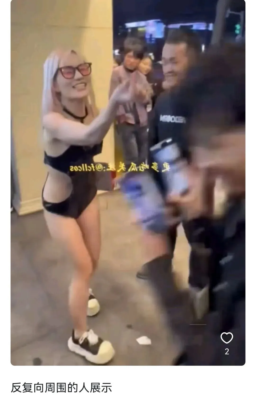 一个35岁的女人,当街跳舞、挑衅、做出带有羞辱意味的手势。