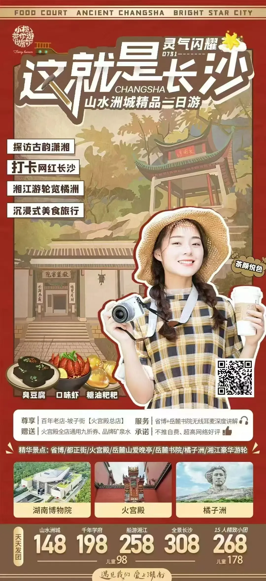 【山水洲城 长沙1日游】湖南长沙旅游:湖南省博物馆+火宫殿+都正街+岳麓山+爱晚亭+橘子洲经典一日游-含车含导游含门票预约不操心天天发班