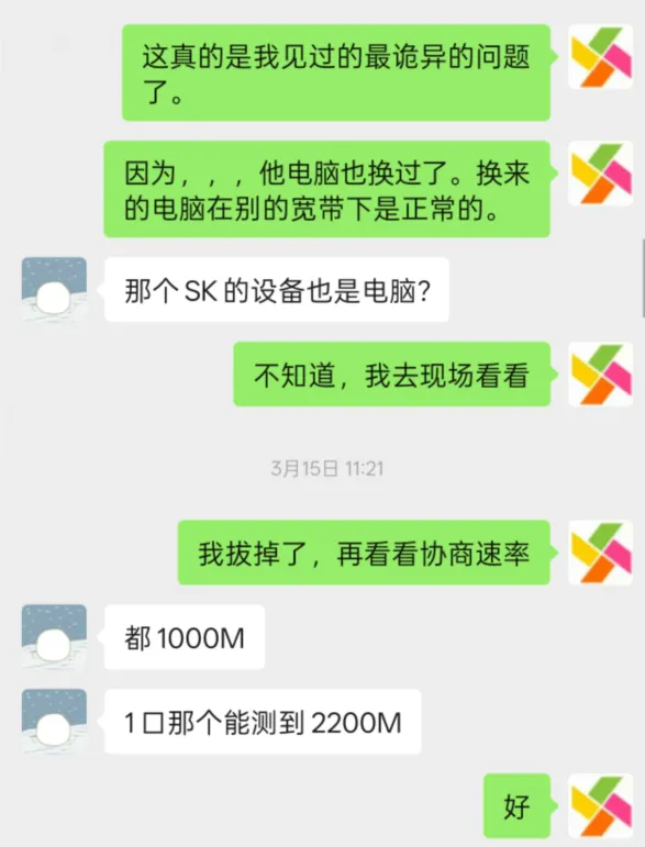 2026年2月,我收到了客户直播公司需要拉多条企业宽带用于直播的需求。一开始,客户是准备弄一半联通的弄一半电信的。担心我们的企业宽带那么便宜,会不会不好用。但是交流中,了解到我们的企业宽带带第二宽带,还可以每套开10张卡,简直为直播公司量身定制。所以最后决定开3套智赋万企企业宽带一二宽,一共6条宽带+电信原来老场地只带一个直播间的399套餐的企业宽带,一共支撑起15个直播间。一开始,我们是折腾拉多条光纤进客户的直播公司,因为一般一个场地只能有一根入户线,要想装多条企业宽带,通过一根入户线进入客户直播公司,就得跳PON口,将这根光纤接入更高的网络层级。不过客户这里,是老的小办公楼,可直接飞线。但是原来的资源做的还是不太行。扩容后,客户直播发现网络竟然会一天卡1-2次。于是,我多次上门,看看怎么解决这个问题。我们一开始想到的,就是网线。把客户的两根网线换了,没用,还是卡。然后以为电脑有问题。因为只有这两条宽带会卡。其他四条宽带不会卡。 客户这里的网络表现是,4根网线的协商速率都会频繁变10M.可是我已经换了两根网线了,换了的那两根也会变10M.不可能换了的网线也那么巧都是坏的啊,其中一根我还在家里试过没问题。 我们起初是觉得,客户买的是成品网线,不会出现那种打水晶头的人手一抖,工艺不行,而因网线出现这样的严重故障。所以,我们先尝试把电脑协商速率锁1G,避免千兆电口与2.5G网口可能协议不兼容。没用。 也确定了内网没有IP冲突。网络连接全部正常,能上网,就是直播卡。 想着客户的可能是ghost系统,卸载并重新安装英特尔网卡驱动,没用。 我又怀疑是不是区域OLT的IPV6设置异常?于是关闭了IPV6,也没用。 还尝试过将华为光猫换中兴光猫,没用(后来才想到这点,是因为6条里两条会卡,同时两台光猫出问题的概率很低。)。基本没辙了,客户也发脾气,于是跟客户说,给他把这几条宽带都退了。 想着之前不是他们简易排查内网问题,都是一根一根拔掉网线来解决嘛。所以我尝试拔掉其中一台电脑的网线,发现直播间断网了,插回去,拔掉另一条网线的时候。要中兴厂家技术支持(前面怀疑光猫有没有问题,光猫换中兴FTTR了)看了,协商速率全部恢复。 然后前天晚上,要客户直播试试,这台设备连接的三个直播间不卡了。