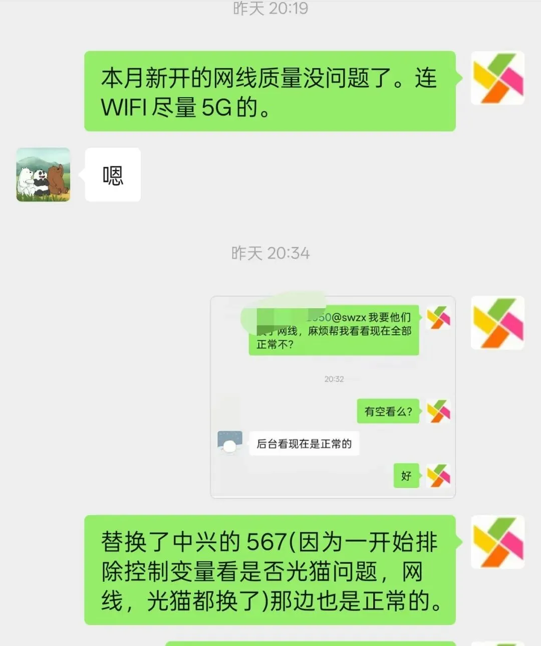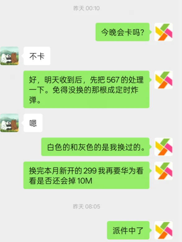 因为567直播间,拔掉了一根客户美团买的劣质网线,换了两根我带过去的网线,还有5号直播间的还是用的客户美团买的同一批次网线,随时可能定时炸弹,所以我网上买了超六类网线给客户送过去。要客户换上并反复确认,拔掉那根神秘的网线后,3个直播间都不卡了。 (写这篇公众号的此时过了0.00,所以截图聊天记录又是显示昨天)