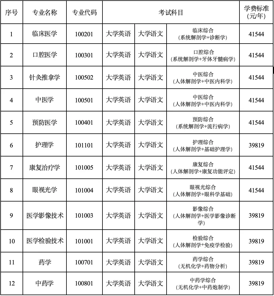 长沙医学院2026年专升本各专业考试科目及学费标准