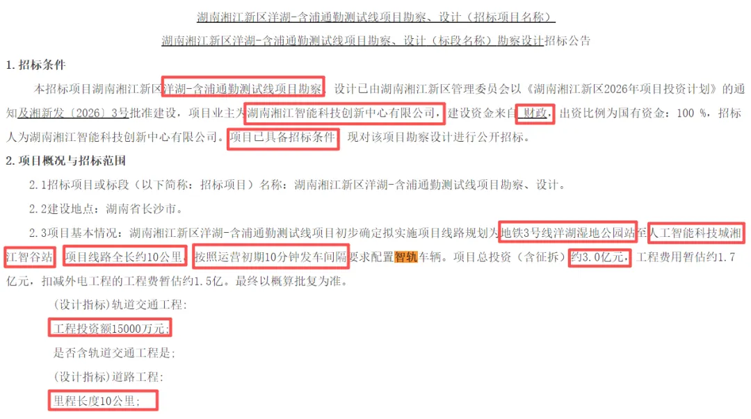这条智轨线路全长约10公里,起点为地铁3号线洋湖湿地公园站,终点至人工智能科技城湘江智谷站,全线将新建10座车站及3座箱式变电所,运营初期按10分钟发车间隔配置智轨车辆。项目计划于2026年4月6日开工,总工期365天,预计2027年4月6日完工。