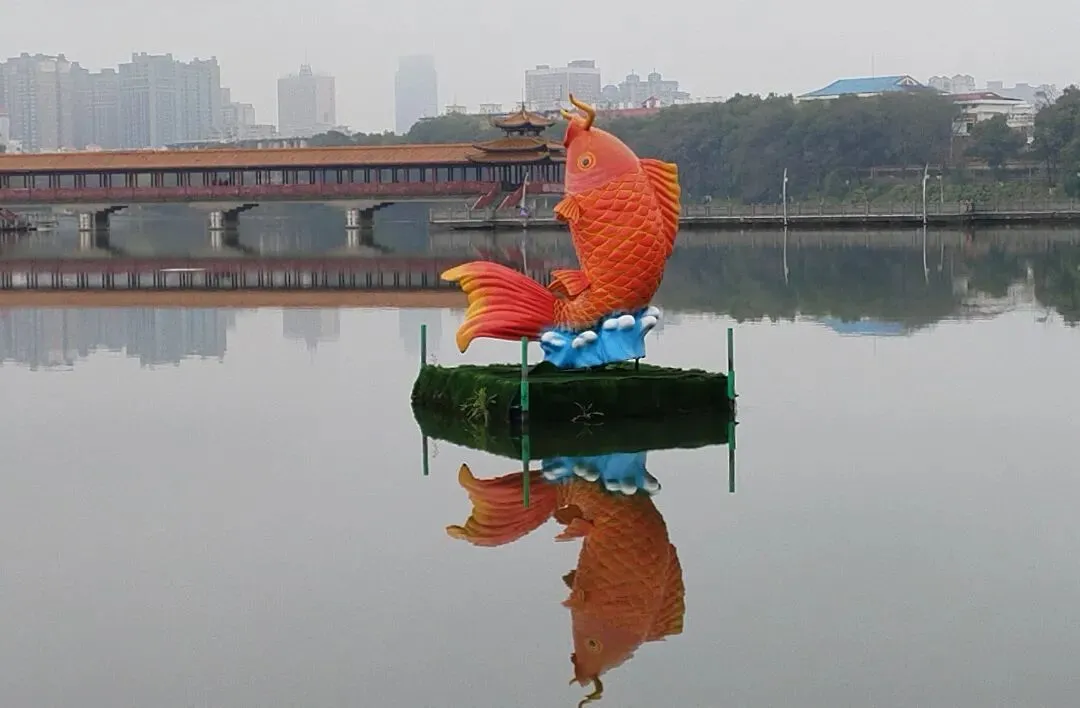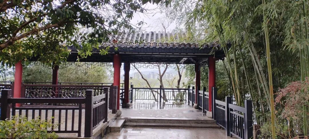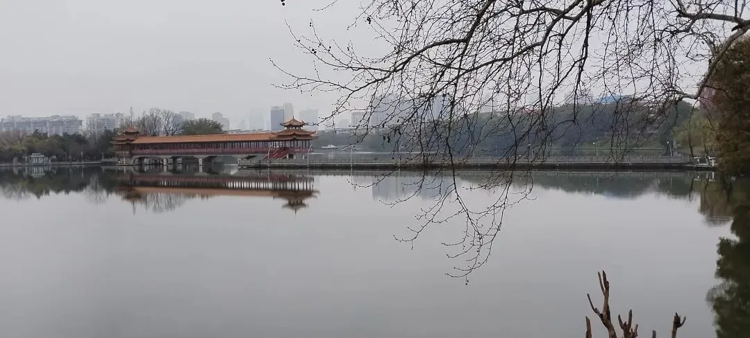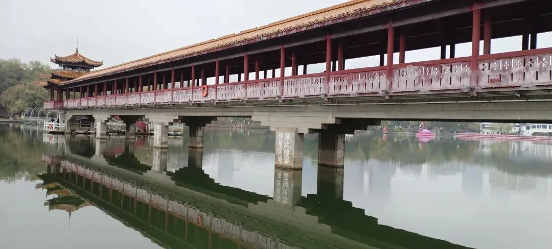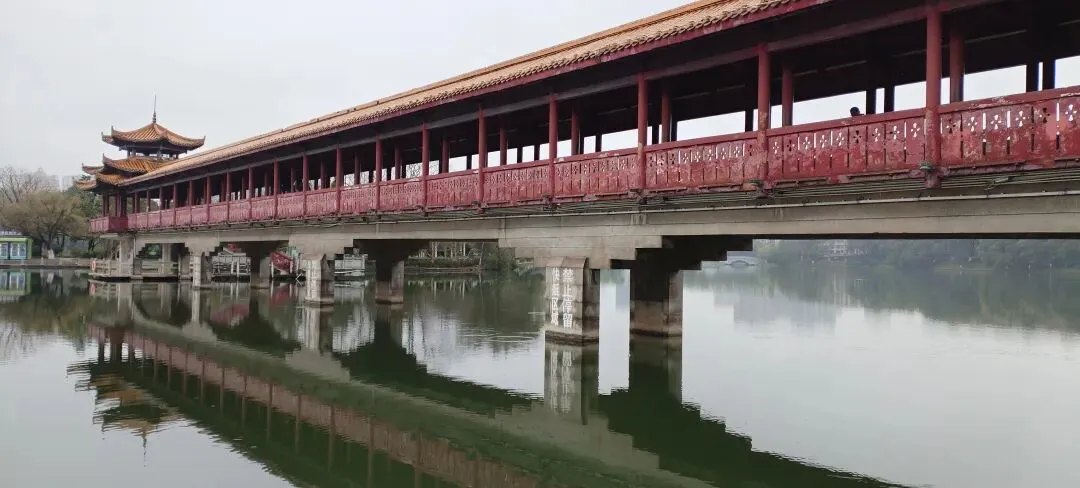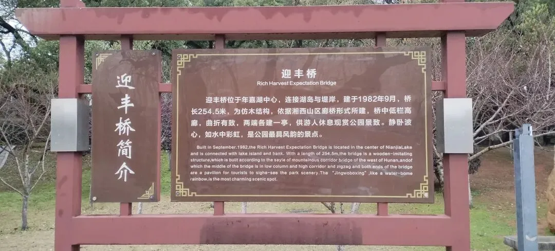 ,位于年嘉湖中心,连接湖岛与堤岸,建于1982年9月,桥长254.5米,为仿木结构,依据湘西山区廊桥形式所建,桥中低栏高廊,曲折有致,两端各建一亭,供游人休息观赏公园景致。静卧波心,如水中彩虹,是公园最具风韵的景点。