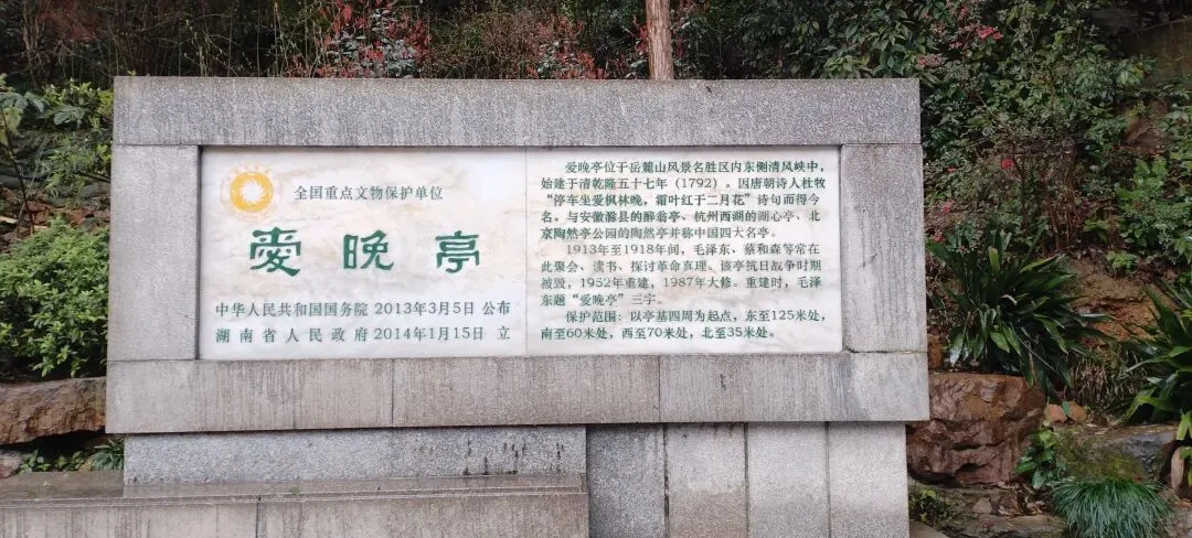 爱晚亭始建于清乾隆五十七年(1792年),抗战时期被毁,1952年重建。毛泽东青年时代常与友人游憩于此,探讨革命真理,亭额"爱晚亭"三字为毛泽东亲笔题写(1952年重建时题)。