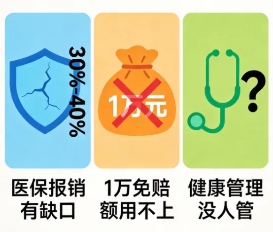 市面上很多百万医疗险都有1万免赔额,也就是说1万以下的医疗费根本不报。但现实中,90%的住院花费都在1万以下——感冒发烧、急性肠胃炎、小手术…这些高频、小额的医疗支出,反而成了家庭现金流的“隐形杀手”。