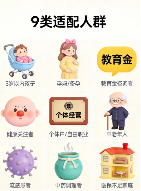 3岁以内的孩子——快保筛选,享受育儿津贴 孕妈/备孕女性——未来3年内医疗需求密集 曾经咨询过教育金和门诊报销的客户——需求明确,转化率高 朋友圈经常发“生病看医生”动态的人——健康意识强,痛点明显 个体户/自由职业者——需要体检+健康管理,但医保覆盖不足 有慢性病的中老年人——需要持续的慢病管理(众民保中高端客户的补充) 已经甲流、流感中招的人——正在经历医疗支出,需求最迫切 长期需要中药、针灸推拿调理的人——高频、小额但持续的医疗消费 所有觉得“医保不够用”的家庭——想要更全面医疗报销的普通人