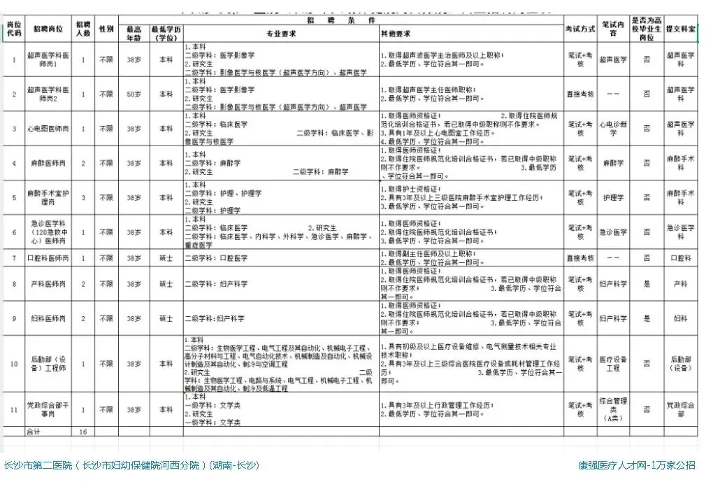 此次招聘岗位11个,招聘计划16名,详见《2026年长沙市第二医院(长沙市妇幼保健院河西分院)自主招聘岗位表》(附件1)。