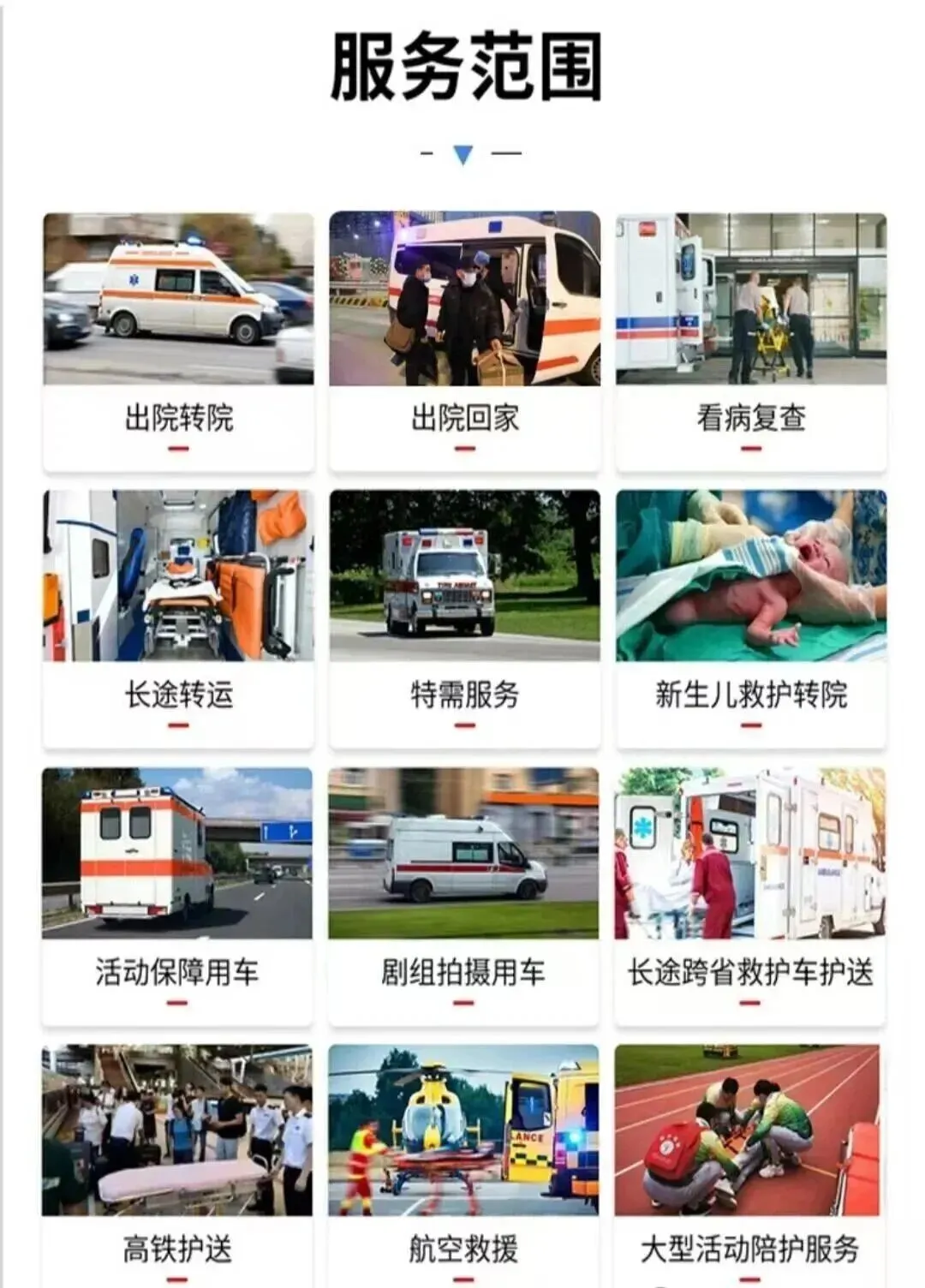我们是救护车转运机构,提供24小时电话预约服务,为方便病人转院、回乡、转运、救护、护送等难题,成立了专业救护服务与病人转送的专项救护车出租部门,无论是市内急救、长途跨省转运,还是特殊病人护送,我们都能为您提供快速、安全的服务。 1、便捷、效率的方式为需要救护车/急救车租赁的客户提供一对一的服务 2、有着丰富的会议、集体性活动服务经验,我们拥有专业的应变能力、场地疏导能力、处理时间能力 3、为病人安排各种救护车/急救车,人员上岗和救护服务标准统一,实现了系统的标准化、规范化,根据家庭成员的需要,在途中提供的医疗服务。 4、救护车/急救车租赁服务有转运跨省救护车,福特急救车租用,租车急救医疗监护车,长途病人护送车转运,监护车接送等 7、派医生护士随车出诊于各省市之间伤病员和病愈者及家属的往返接送,我们以"、顺利、即时"的工作精神体现了我们的救护服务理念,承接跨各省市救护转院、救护车送病人到各个区域。车上重症监护设备齐全,急救装备随车配备呼吸机、吸痰机,多参数心电监护仪,便携式除颤器,无创呼吸机等设备。于各省市之间伤病员和病愈者及家属的往返接送,我们以"、顺利、即时"的工作精神体现了我们的救护服务理念,承接跨各省市救护转院、救护车送病人到各个区域。车上重症监护设备齐全,急救装备随车配备呼吸机、吸痰机,多参数心电监护仪,便携式除颤器,无创呼吸机等设备。广州救护服务中心自成立以来,本着“救生”的精神,本着“安全、速度、服务”的精神,在有关部门的大力支持下,为广大群众及其家属解决转运难题,成功地为伤病员脱险、挽救生命、恢复健康提供了保障。公司得到来自患者和家属的表扬和赞同。司机在上岗前必须通过严格的检查,医务人员,包括医生和护士,在行业中有多年的救护经验,我们的服务是以病人为中心的,每次护送我们以更快、更安全的措施保障病人能够及时、安全到达目的地。不管是病人出院回家,还是需要转院接受进一步治疗,只要您需要专业的转运服务,别犹豫,直接联系我们:📞救援热线 4009962227,💬微信客服 13829799120。我们 24 小时在线,用专业与实在,陪您和家人安稳走过每一段转运路!