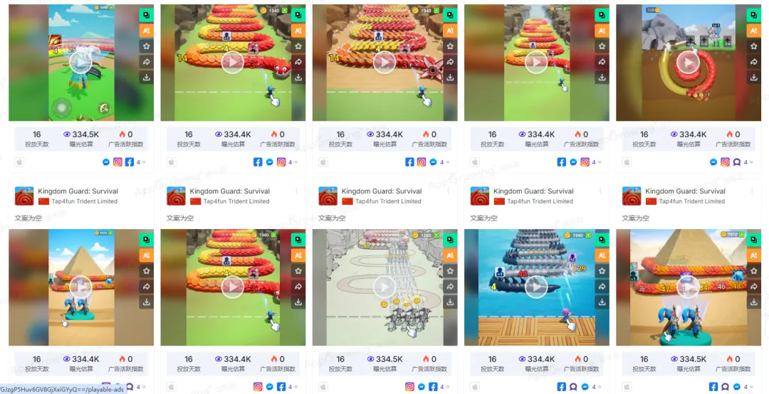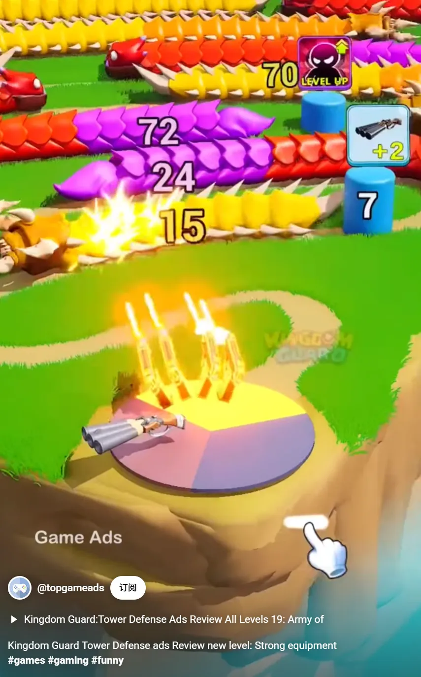 当然,《Cell Survivor》的诞生,本身也是一次对买量市场的精准狙击,游品科技的CEO侯添乐在公开分享中提到,立项的灵感是来自于对海外素材的敏锐观察,早在2023年,Tap4Fun旗下的SLG游戏《Kingdom Guard》就大量投放过一种“打龙”素材:玩家在疯狂射击一条由数字组成的长龙,随着子弹的倾泻,数字也跟着疯狂跳动。