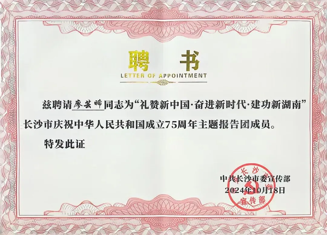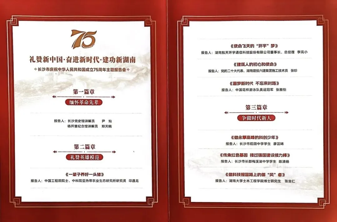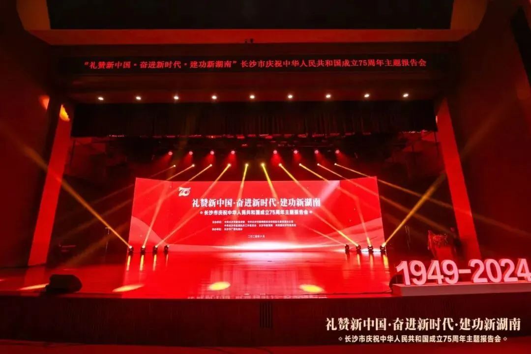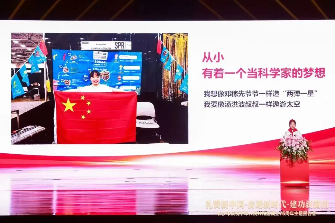 10月18日,“礼赞新中国·奋进新时代·建功新湖南”——长沙市庆祝中华人民共和国成立75周年主题报告会在长沙人民会堂举行。长沙市稻田中学初一年级C2412班学生廖芸晞作为长沙市中学生代表上台深情讲述。