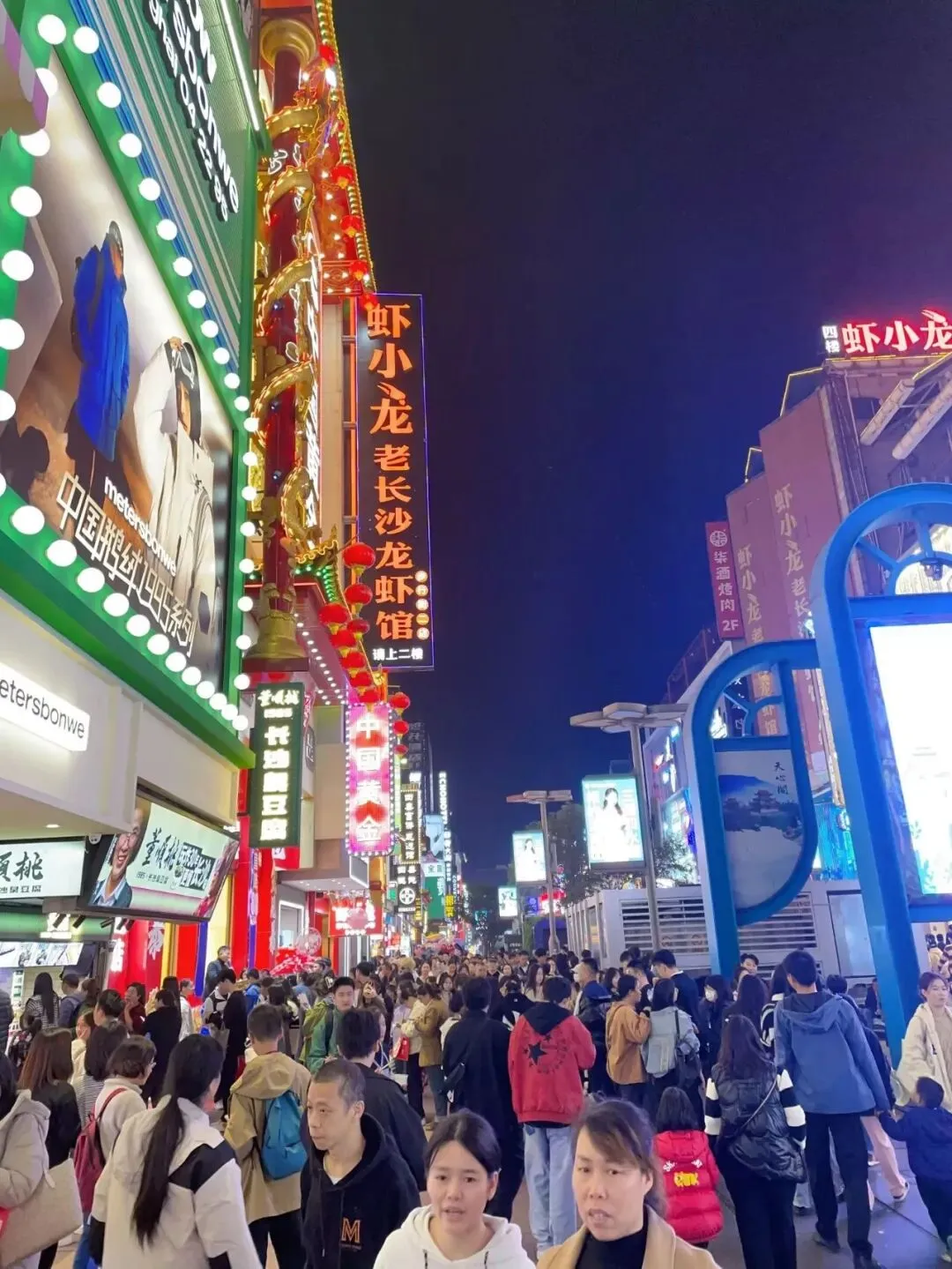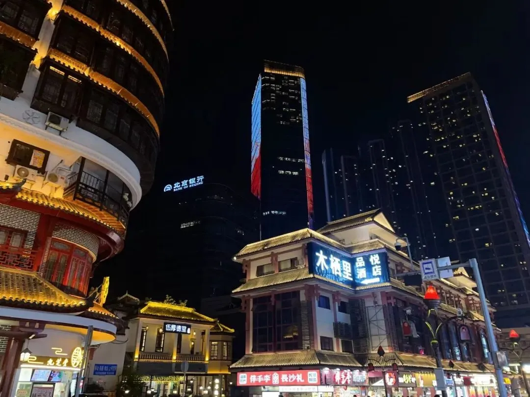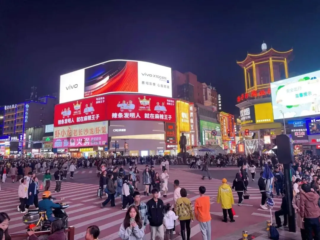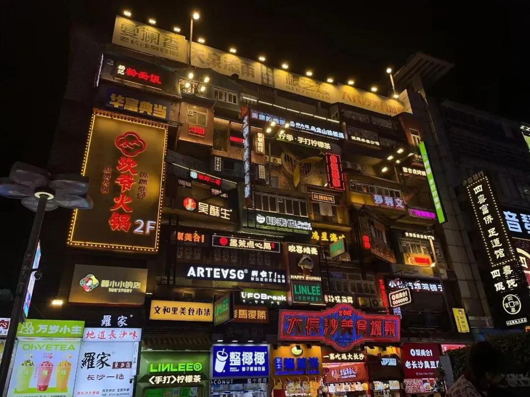 黄兴路的LED屏流光溢彩,街头艺人的吉他声混着炒勺声,织成长沙的夜曲。人们坐在台阶上分享刮凉粉,举着奶茶在光影里拍照,连风都裹着快乐的因子。
