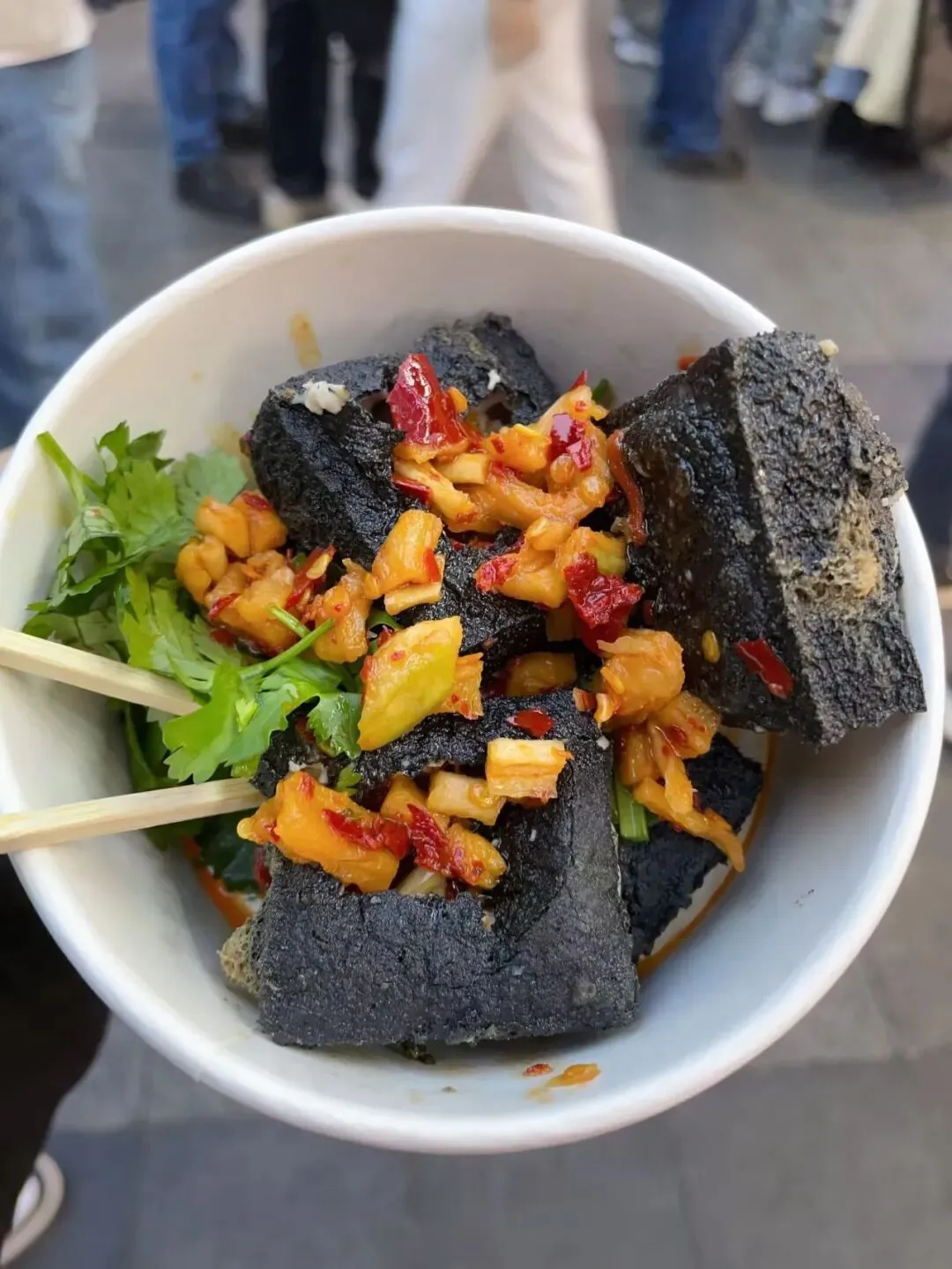 黑色经典臭豆腐的摊位前永远挤满人。老板娘的长沙话吆喝声中,炸得鼓胀的豆腐浇汁撒料,一口下去辣得额头冒汗却停不下筷。隔壁茶颜悦色的队伍蜿蜒,捧一杯幽兰拿铁,奶油顶的绵密混着碧根果碎的脆香,茶底清冽回甘。