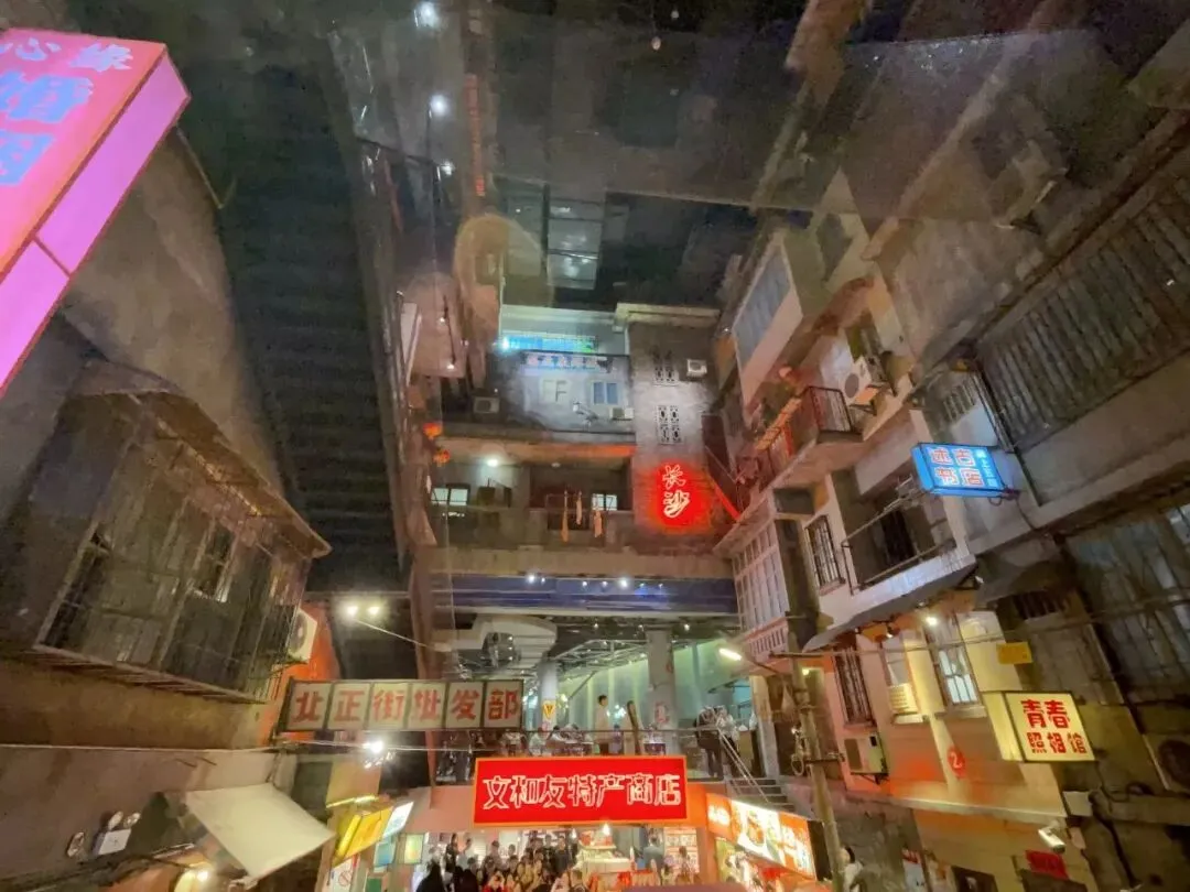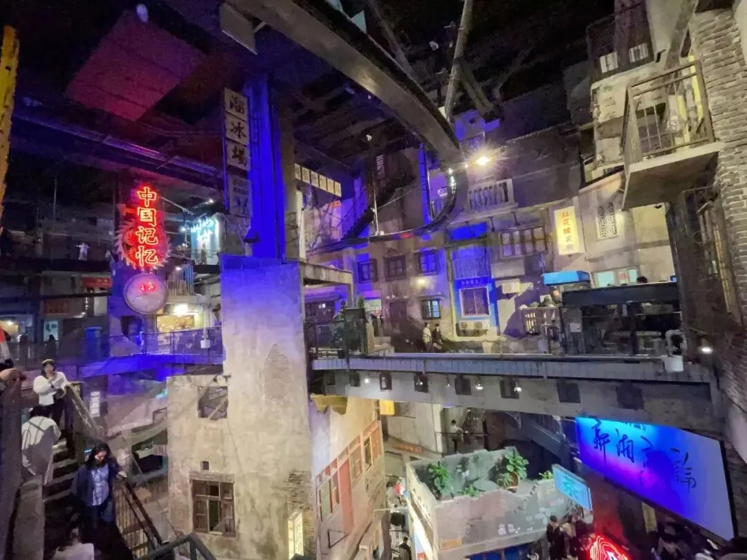 从一楼到五楼,如攀爬记忆的山:外墙爬山虎枯了又绿,栏杆锈迹斑斑,墙面的裂缝带着岁月褶皱。垂直巷弄里抬头,楼宇如积木堆叠,霓虹灯牌、手绘标语、晾晒床单在头顶交织,恍如站在烟火深处。二楼的复古天桥是必打卡点,俯瞰整条“老街”:卖花小推车、穿的确良衬衫的店员……每一帧都像从老照片裁出。